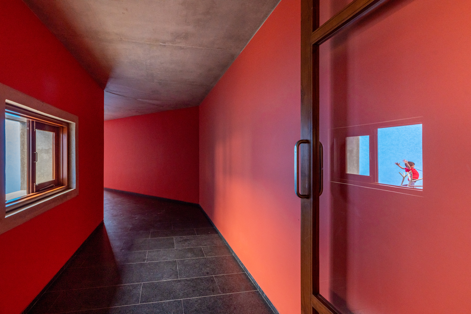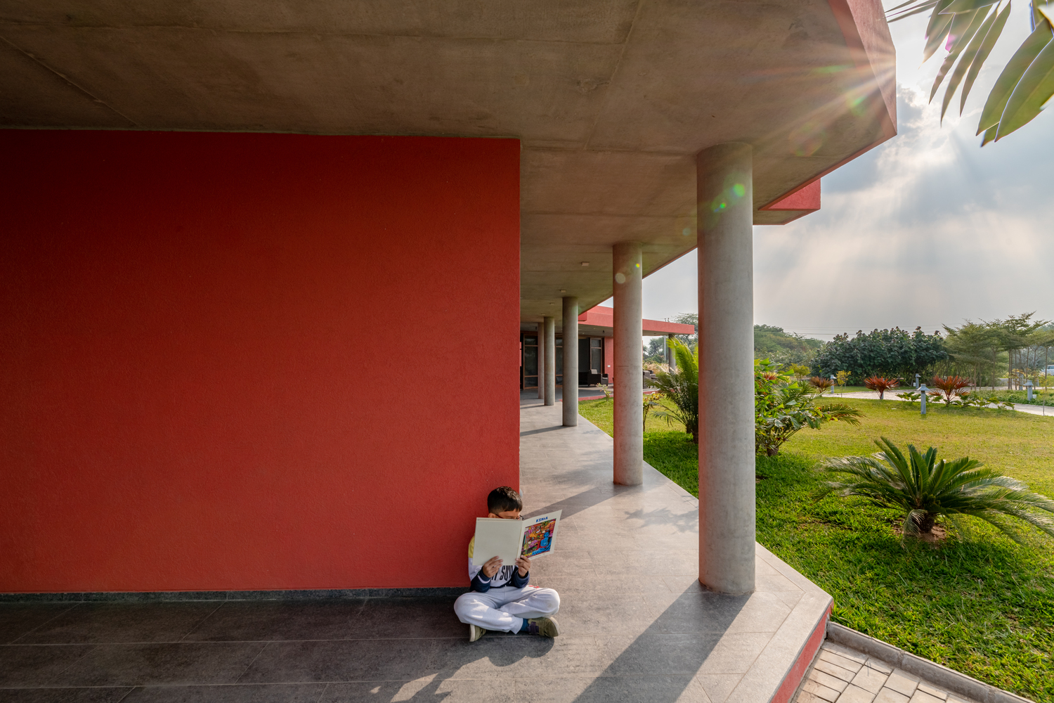 Varied Volumes - As a passive design strategy, the habitable rooms were given a greater height than the circulation spaces and the verandahs. The beams of the verandahs were continued in the rooms, and a non- structural wall was constructed above it that supports the ventilators. The windows allow the summer breeze to come in, whereas these ventilators help flush out the hot air, keeping the space much cooler.