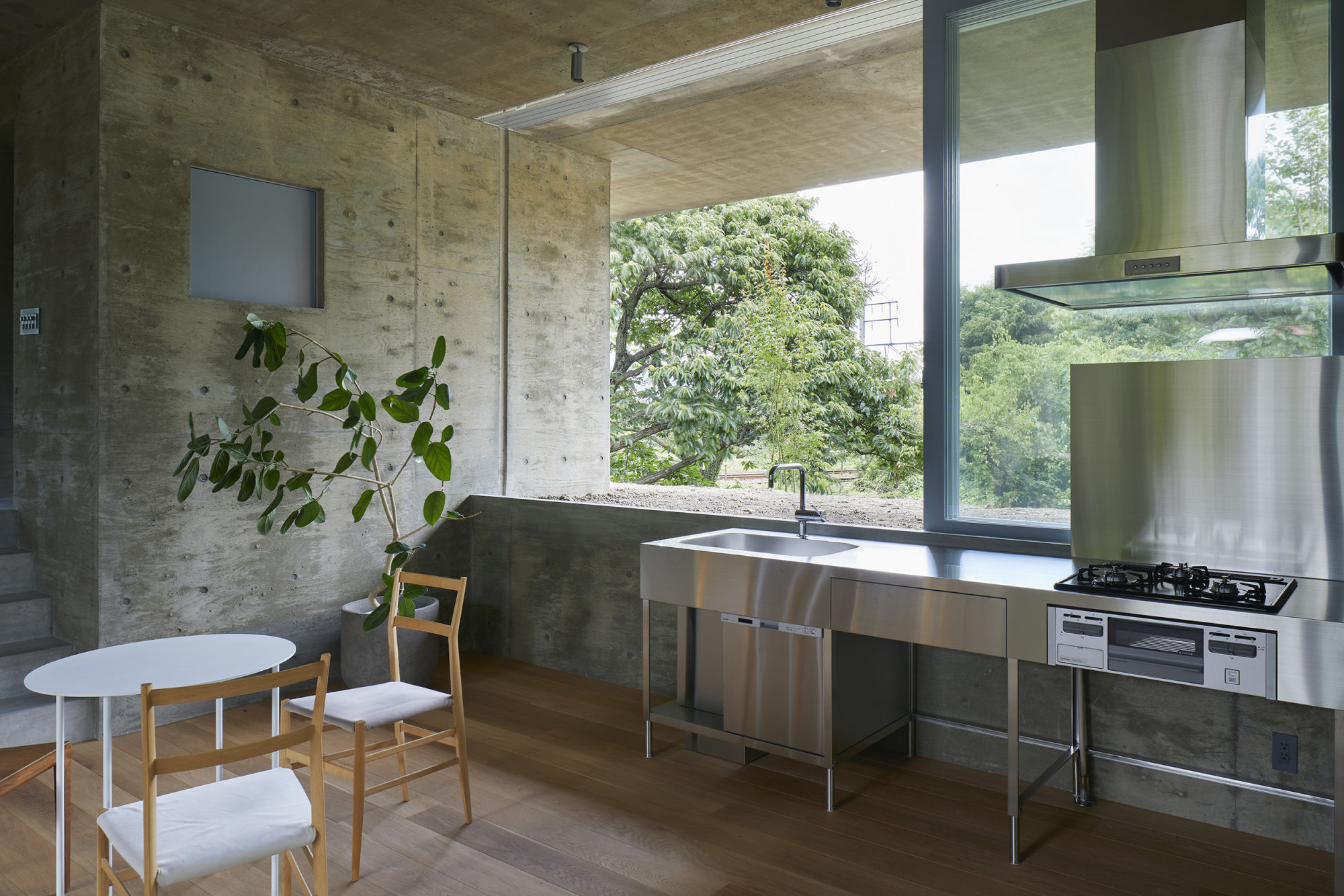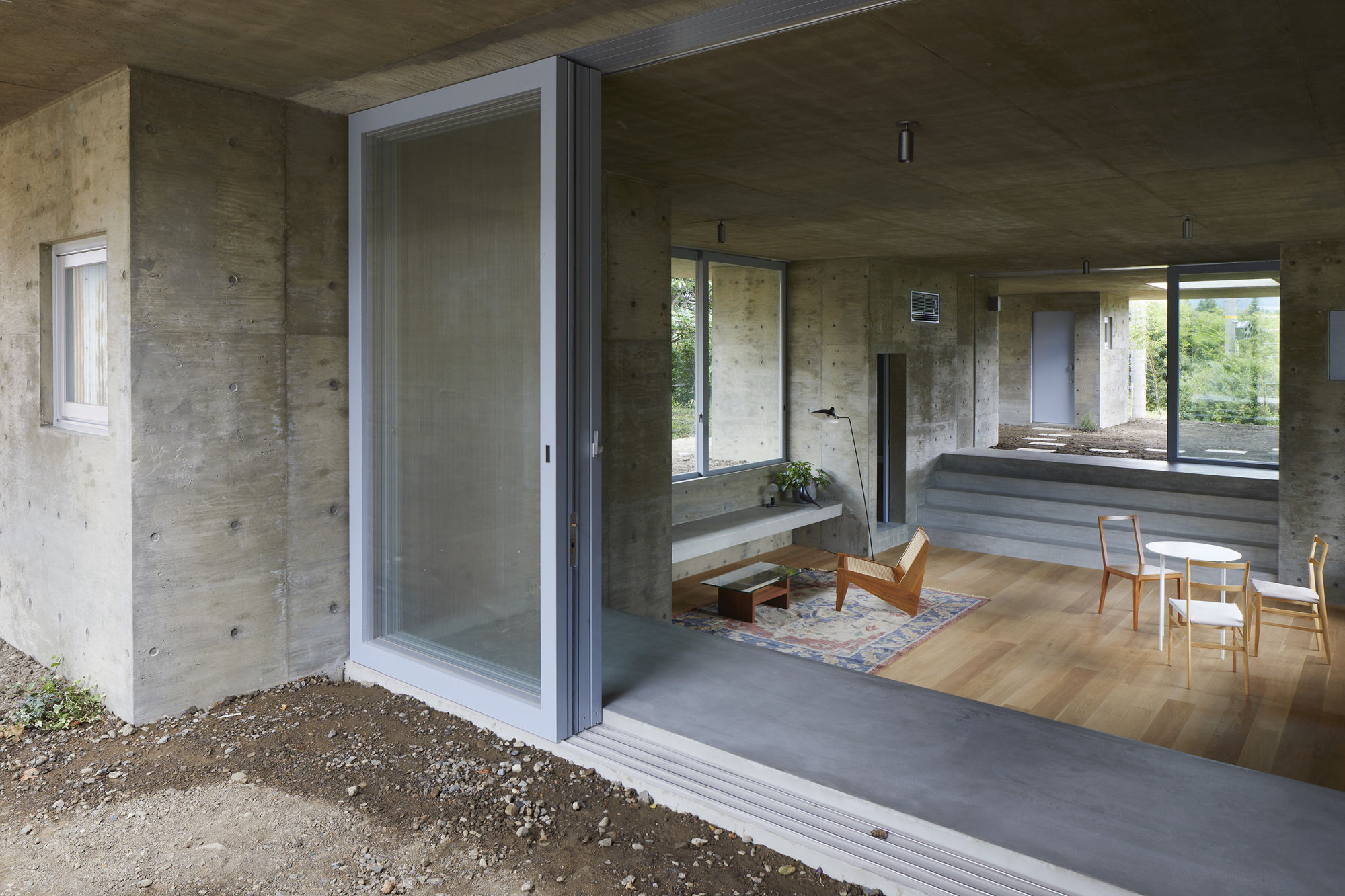The central living space is a semi underground space. By lowering the floor level from the north and south terraces, the ceiling height is secured, and while the undulating waist wall is a four-way glass-enclosed space, it is intended to block the line of sight from the surroundings and create a relaxing atmosphere. There is also a resting hut with a roof in the center. The structure was a wall-type RC structure, and the cost was cut by simplifying the construction method. As a result, in addition to a one-story space where the outdoors and indoors are smoothly connected and the blessed nature of the surroundings can be fully incorporated into the building, a rich living space with expanded possibilities is created on the roof.
