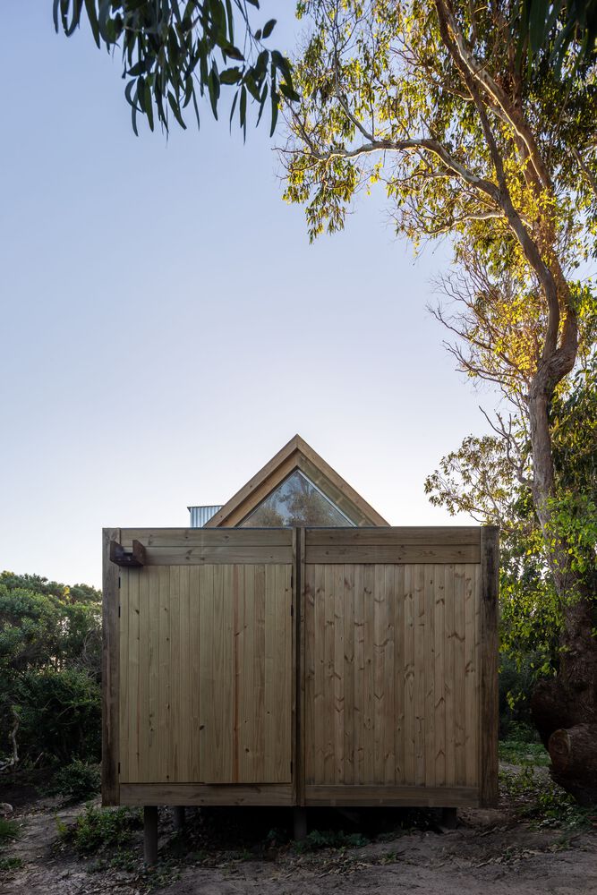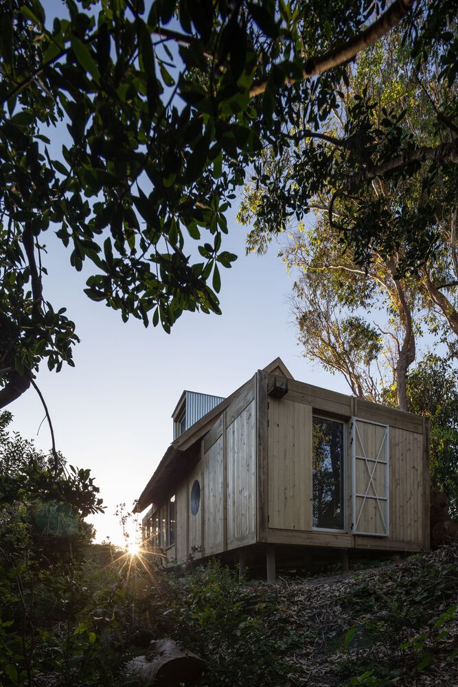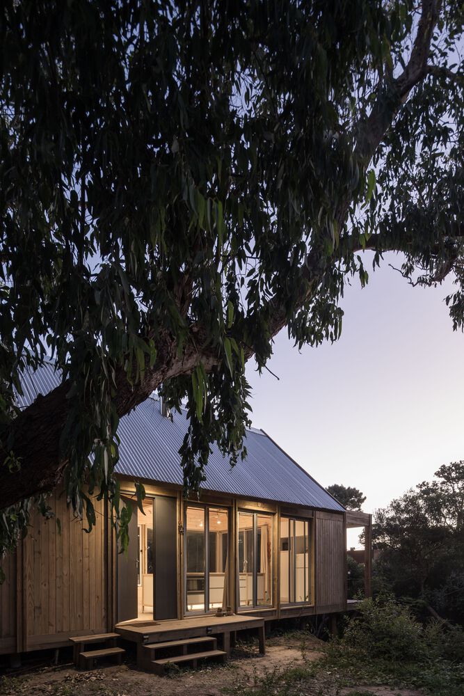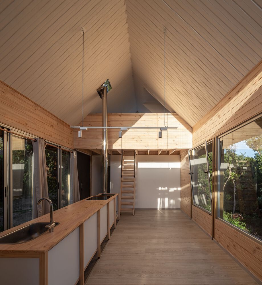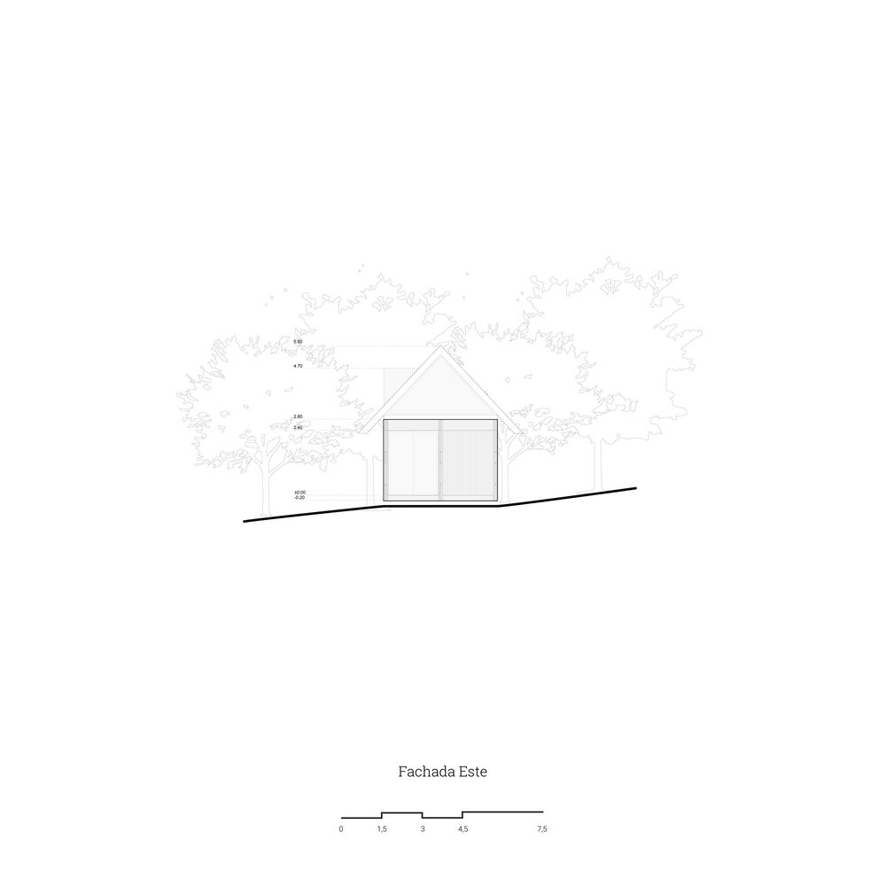 The shelter is assembled in a longitudinal position that divides the land into two different sides. The first one is pointed to the north, and it is organized in a logical way, as there is an interior exterior access link. The second one is south facing where there is a new contemplation logic to look at the landscape from a series of specific cut-outs in the shell and cover.