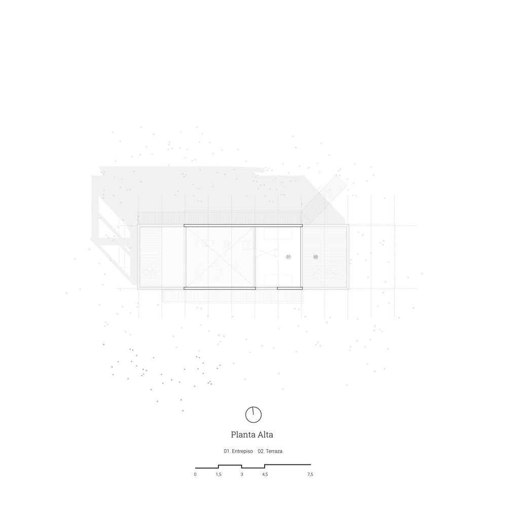 It was decided that the project would try to keep this ecosystem as intact as possible to reduce the green footprint. It is decided to opt for a stilt type foundation system made up of concrete piles that will be supported on the ground, leaving the entire construction suspended on the irregular surface of the ground.