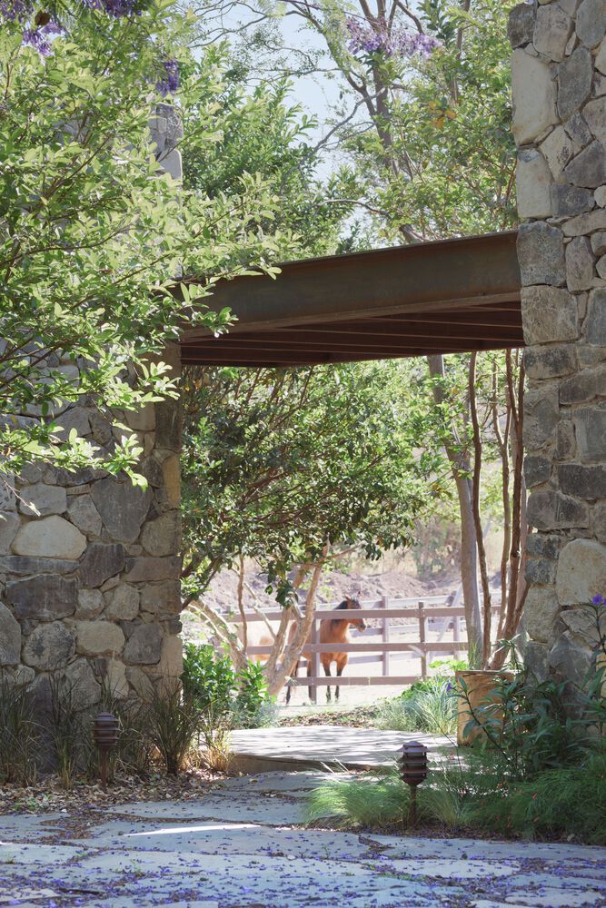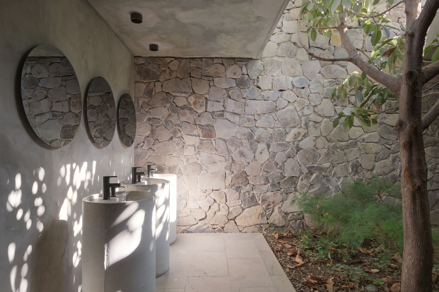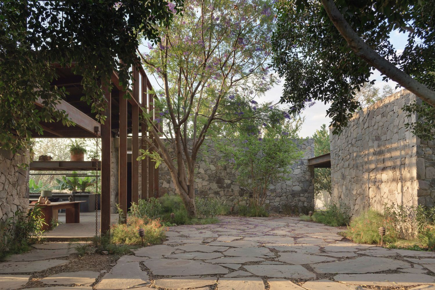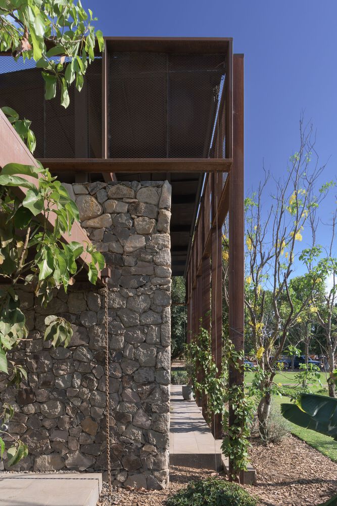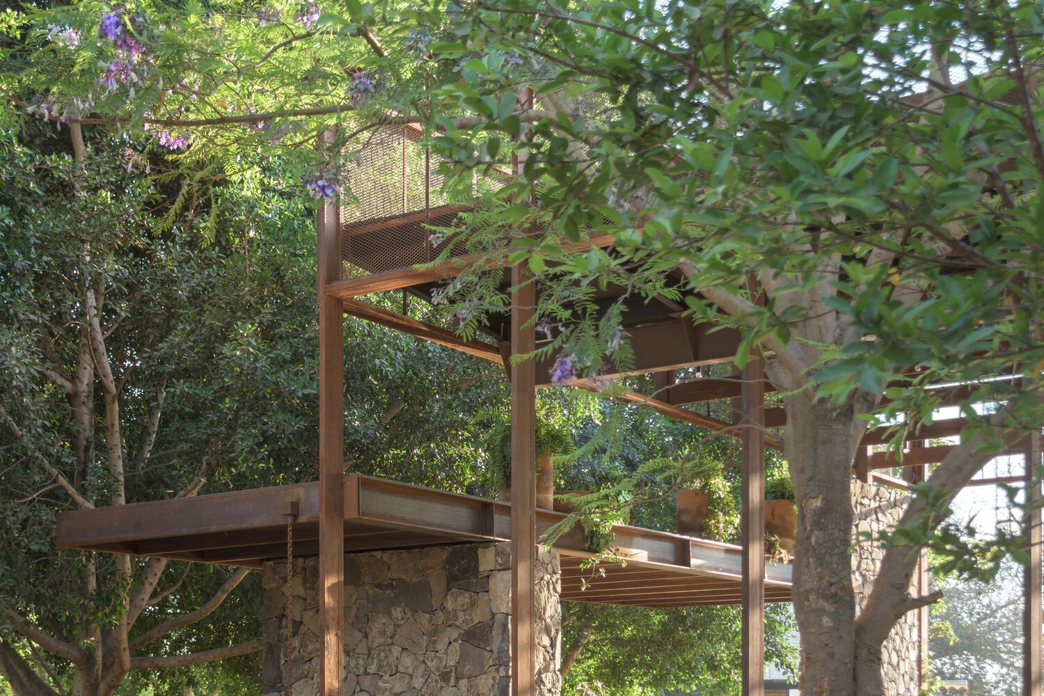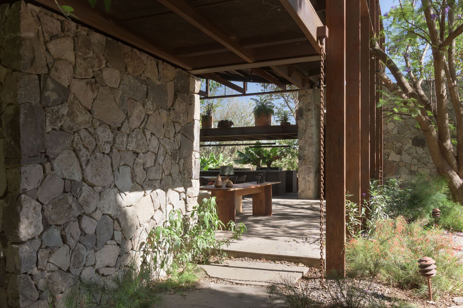 In response, the proposal was to articulate both scales of the program by creating a void that connects the landscaped area with the terrace and around which the different parts of the program were developed. The location of this patio was determined also by the pre existence of a Jacaranda tree that provides shade and color to the space during its flowering stage. The volumetry of the project is made up of three main elements. Two stereotomic stone prisms build up the east and north façade of the central patio, inside which are the restrooms and the cellar area. And the third volume with a tectonic character and slender columns that structure a perimeter at the top to visually order the traces of the pre-existing roof. This volume houses the living areas and forms the west facade of the central courtyard. The project can be completely transited through roofed circulations, but it is developed to live in constant contact with the outside.
