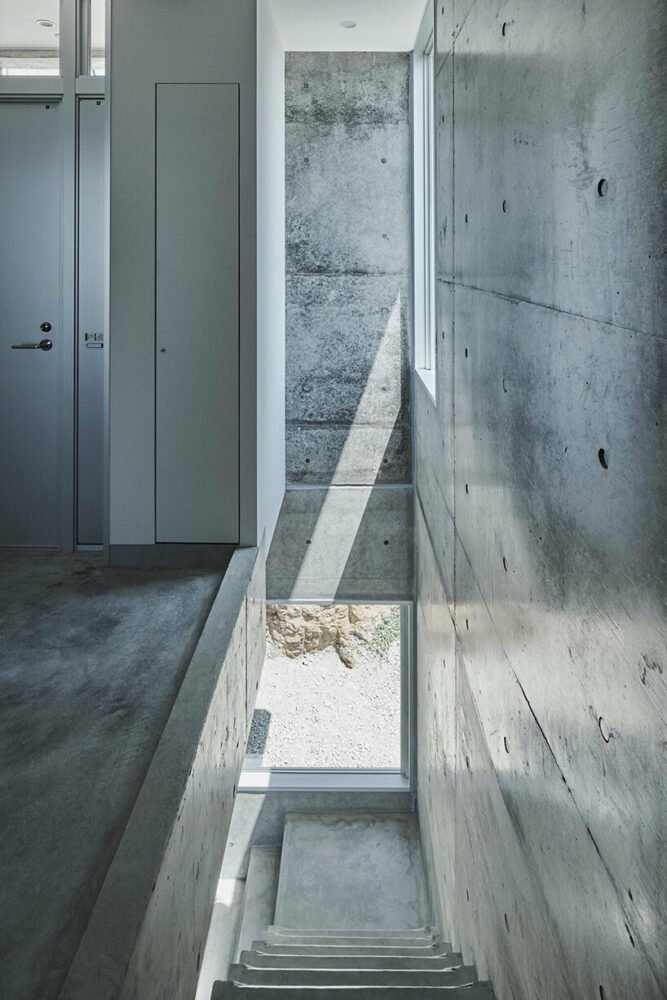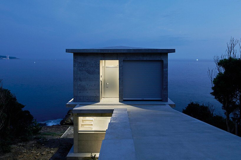 Besides the exterior facades, the Osaka based studio has used unfinished cement in the interiors, too. From the walls and floors to the shelves, and the floating staircase, all spatial elements are made of concrete. The open-plan living space showcases a staggered floor plan, thus reflecting the sloping terrain of the location. Each floor has windows facing the sea, an open-air bath, and a balcony open directly to the sea.