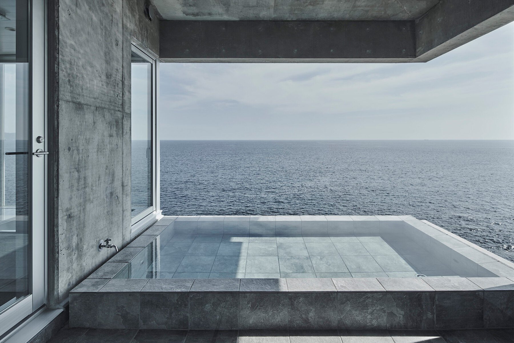 Because of the sloping terrain, the frame is composed of reinforced concrete, and a durable frame structure is used. The back side of the formwork is purposefully employed to transfer the wood grain, and by giving it a scale like variation, the mass has an organic delicacy. Each floor features sea-facing windows, an open-air bath, and a balcony with direct access to the sea. When the bedrock that was exposed during construction is covered with trees again, the desired landscape finally emerges.