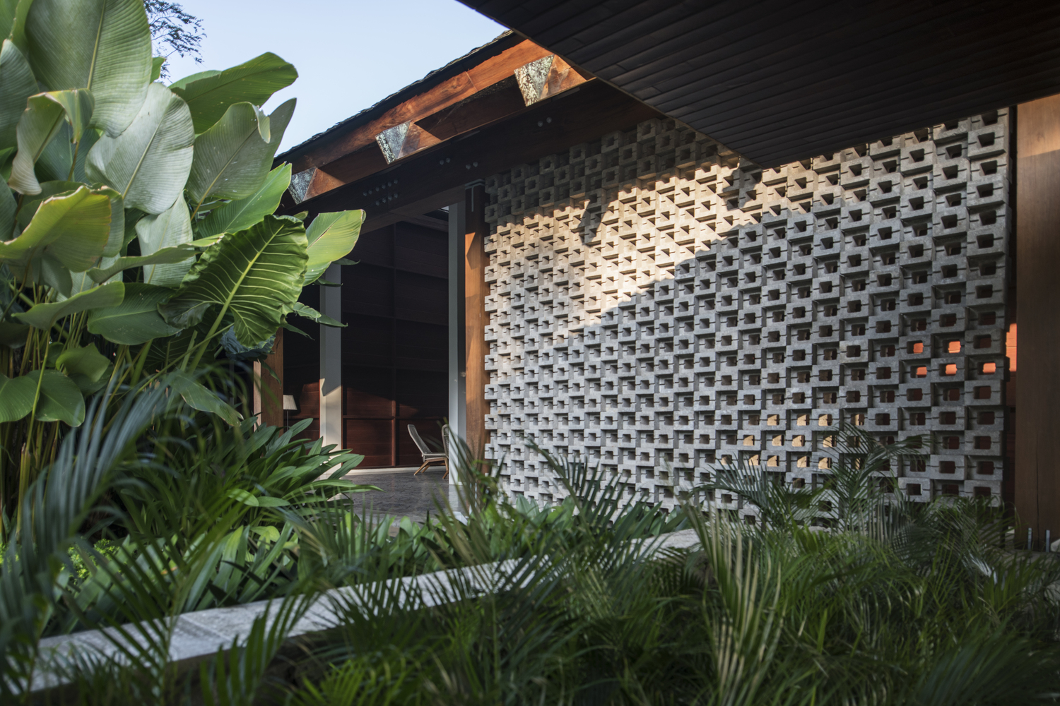 The various rooms and buildings on the property are connected by a series of corridors and footpaths which also helps to cool the property during the harsh sunny day while minimizing the use of air conditioning. To further help with the air circulation, wooden vertical slats and perforated concrete blocks are strategically placed throughout the property which also creates captivating silhouettes and shadows.