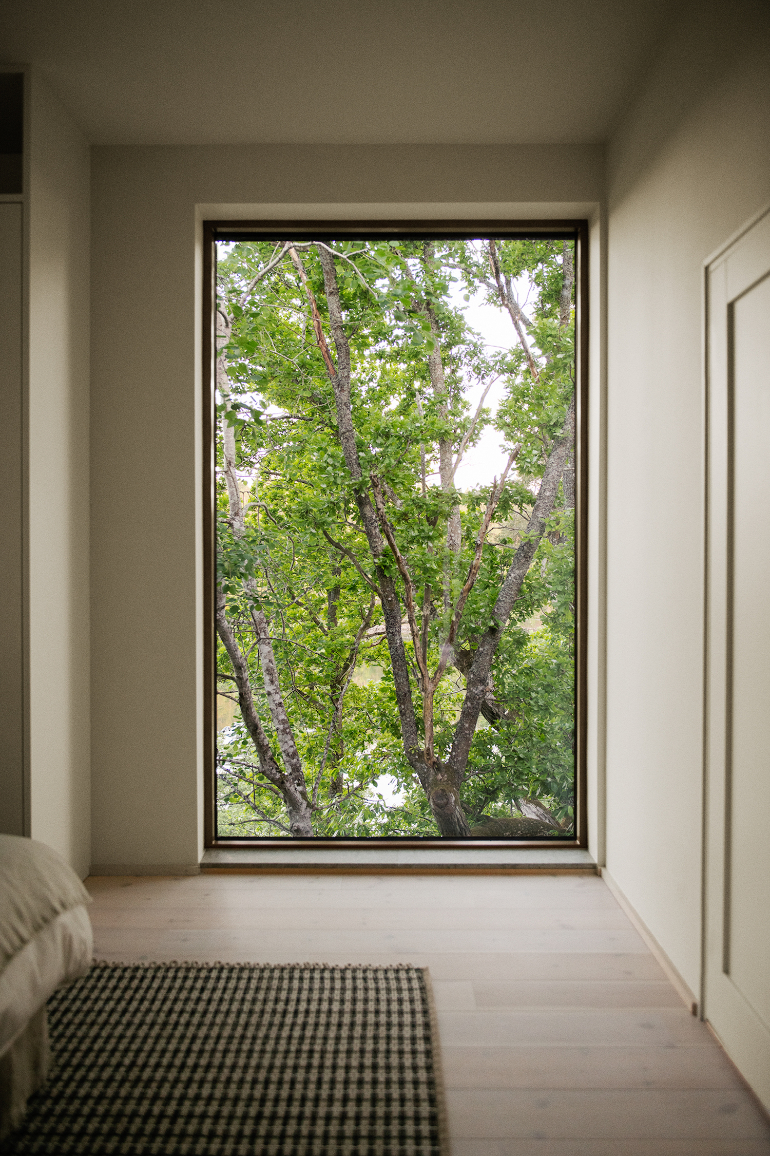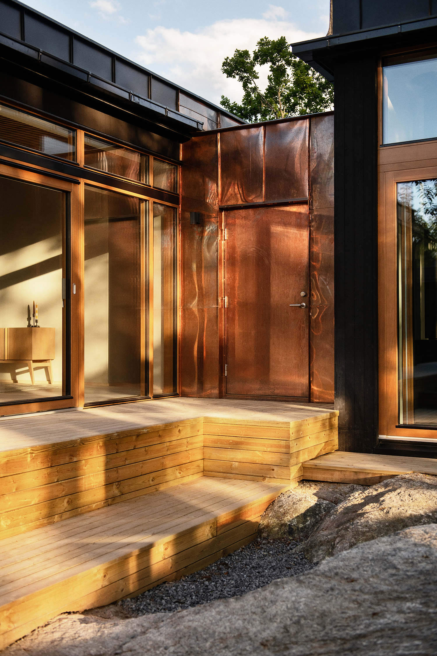 Villa Strömma is a minimal residence located in Strömma, Sweden, designed by AndrénFogelström. On a cliff in the archipelago, overlooking the water, the villa juts out among the treetops. The residence is entered from the higher level, a dramatic entrance via a span that spans a mountain crevasse. The place is characterized by mature trees that have been saved inside the house knot. A configuration of three house bodies gathers around a Japanese garden with raked gravel and rock outcroppings. The rooms are organized so that a long one houses private bedrooms while the kitchen and living room open up to both the view and the inner courtyard. The buildings are clad in standing black wooden paneling with black tin roofs. The main entrance consists of a connecting part that is completely clad in copper. Large wooden window sections characterize the architecture, as well as the slender steel columns that carry the cantilevered parts and the generous balcony out to the water.