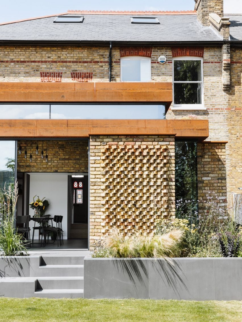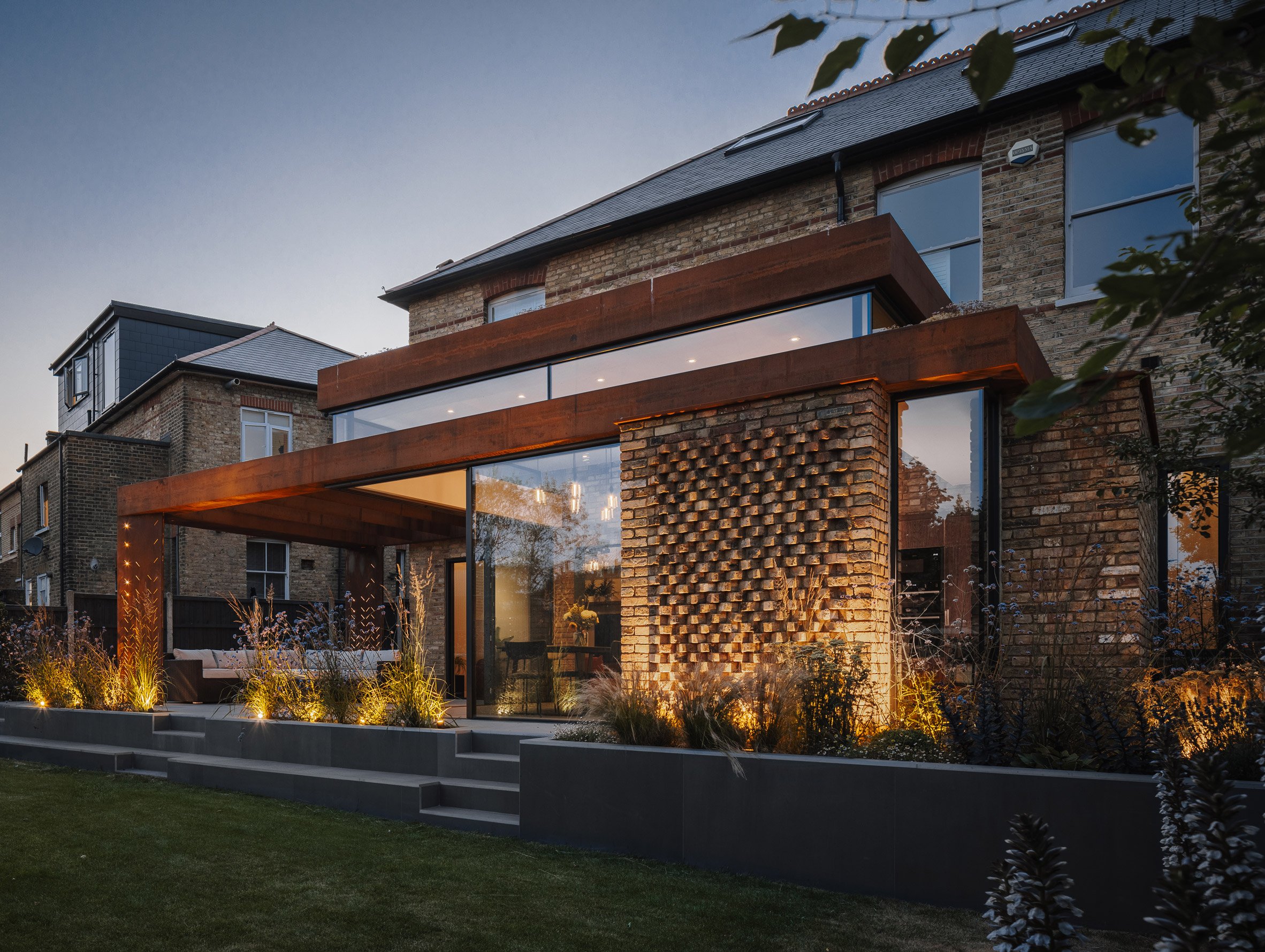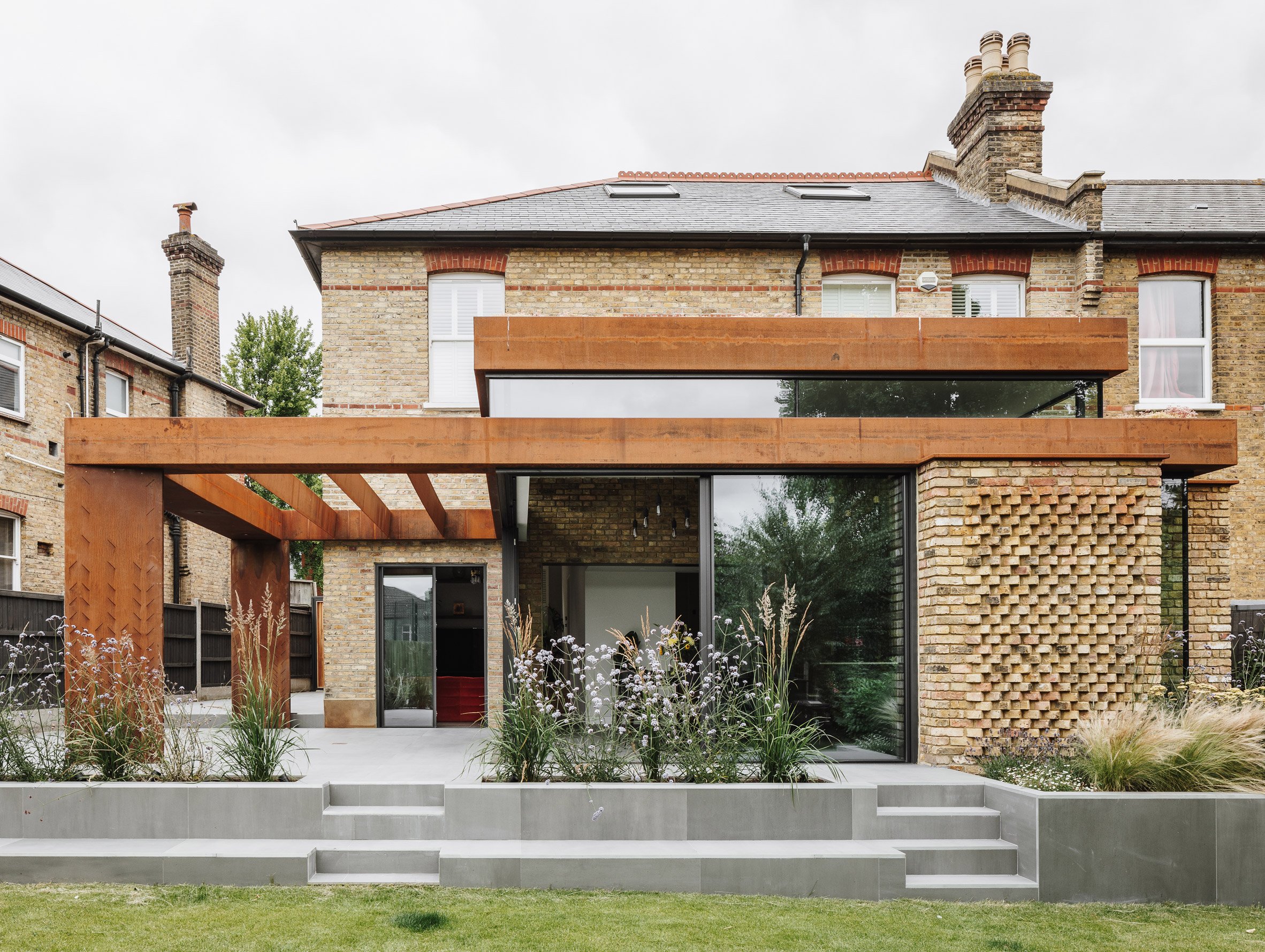 Outside, the extension is characterised by a weathering steel structure that extends across from the kitchen and dining area to form a pergola above the outdoor dining space.