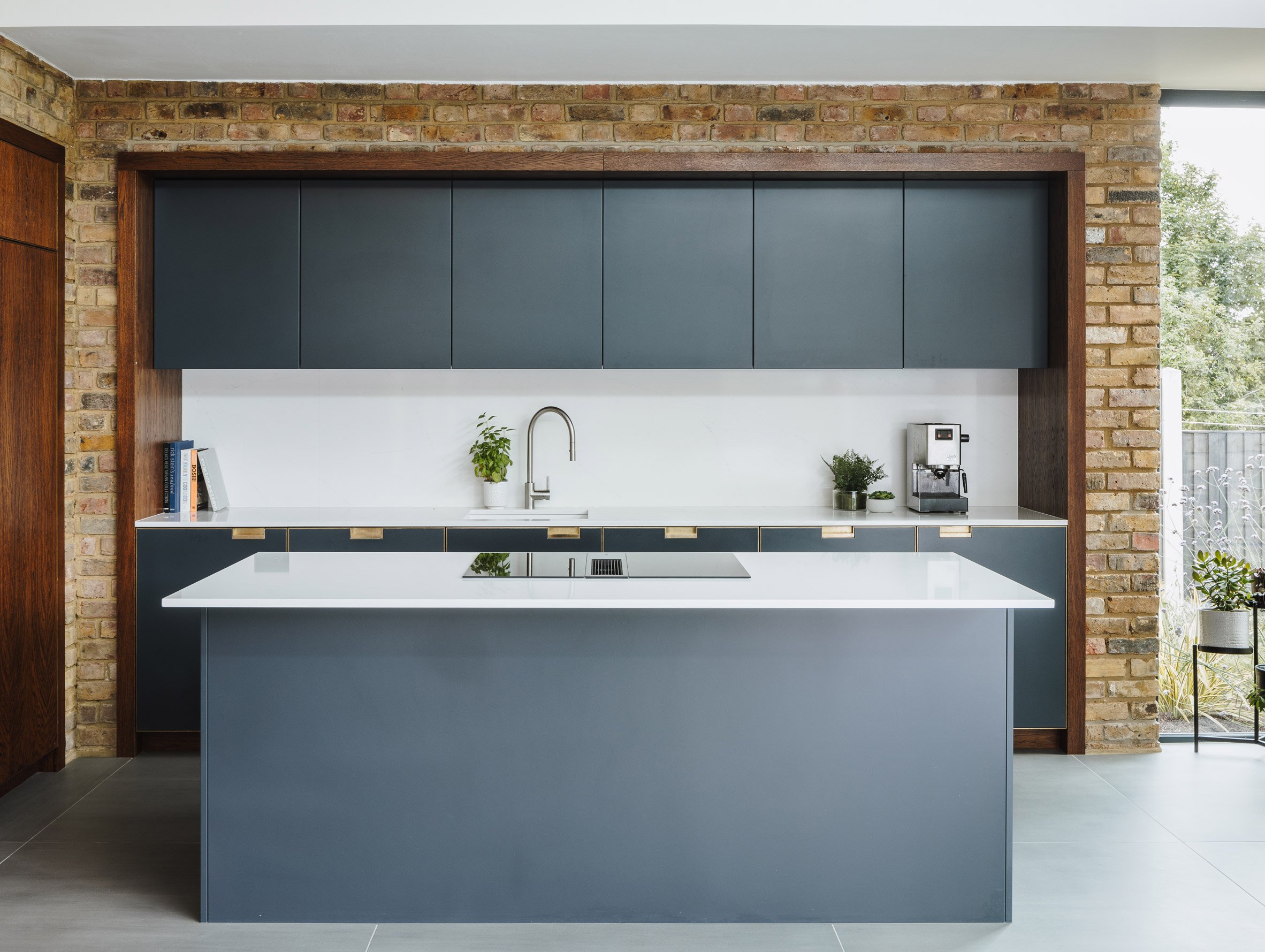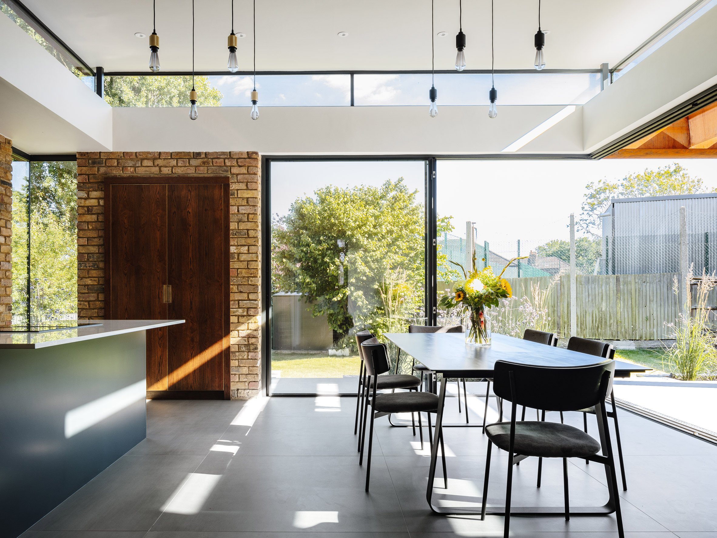 A small existing extension was removed to make way for a new kitchen and dining area, contained within a single storey volume added directly to the original brick elevation.