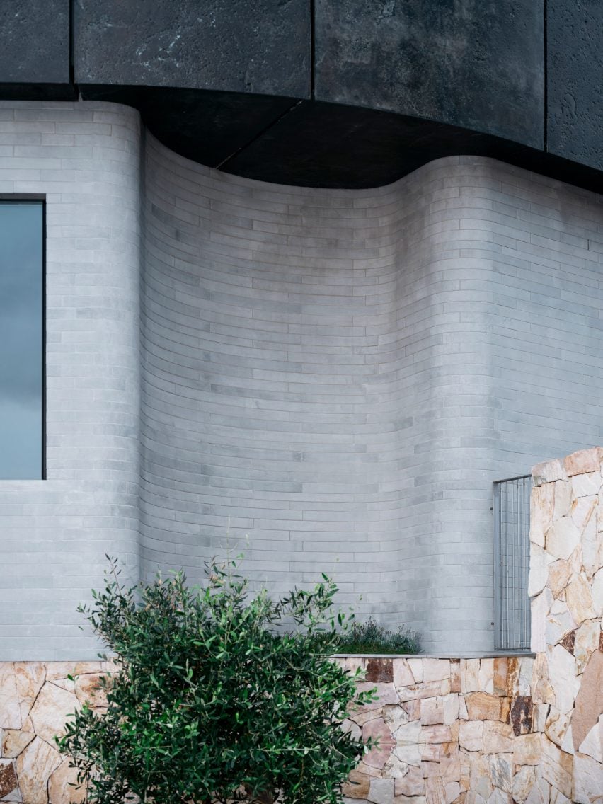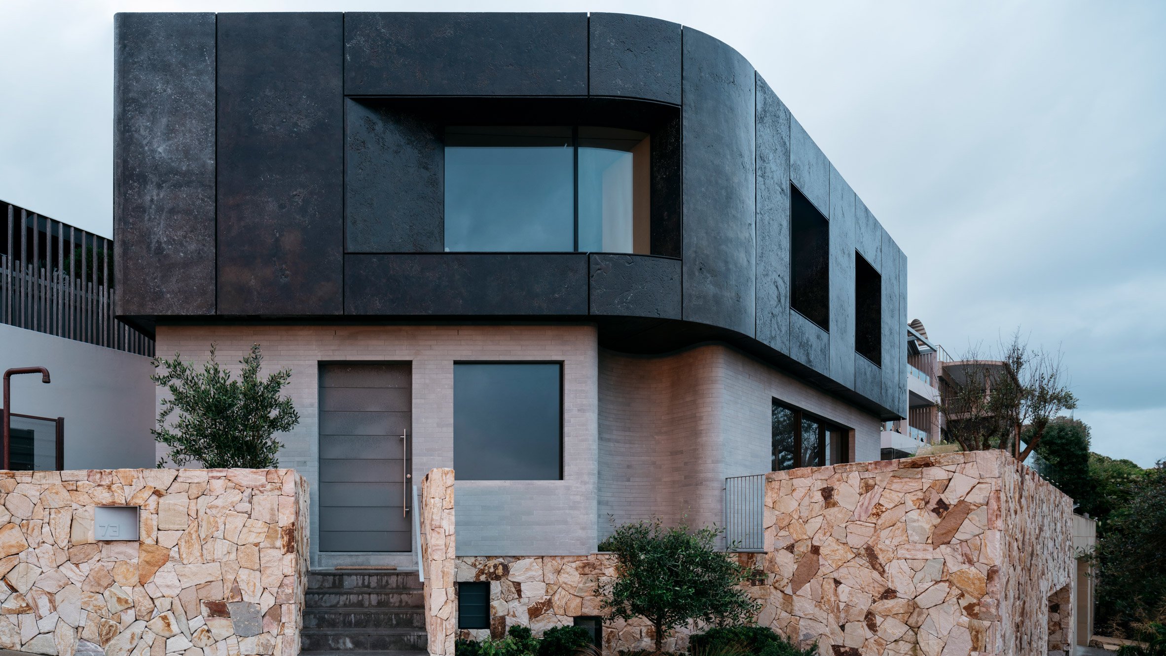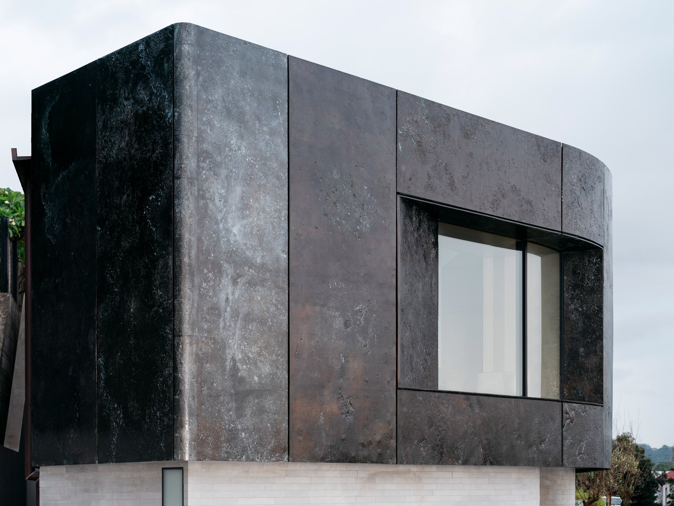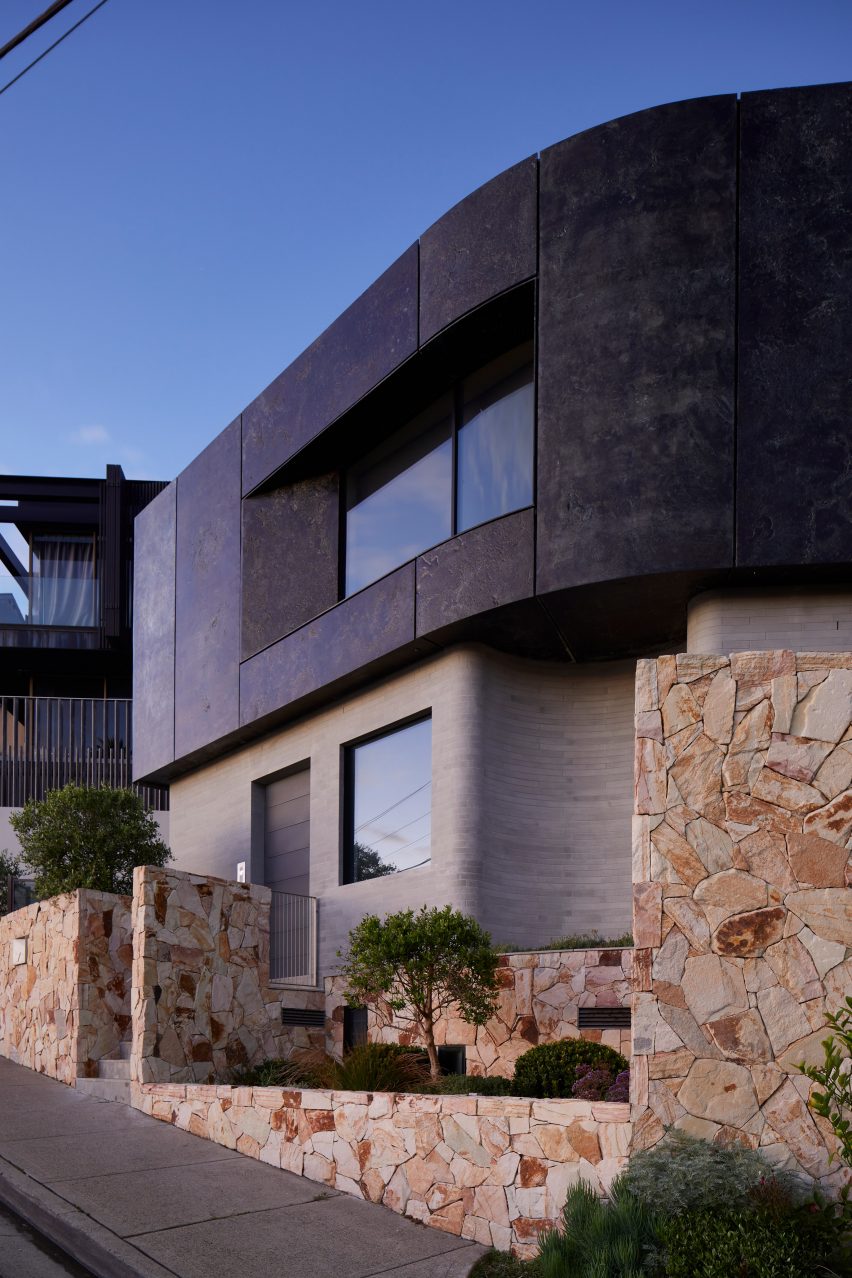 A curved bronze facade sits atop a sandstone podium at this home renovation in Sydney, Australia, designed by local architecture studio Atelier Andy Carson.