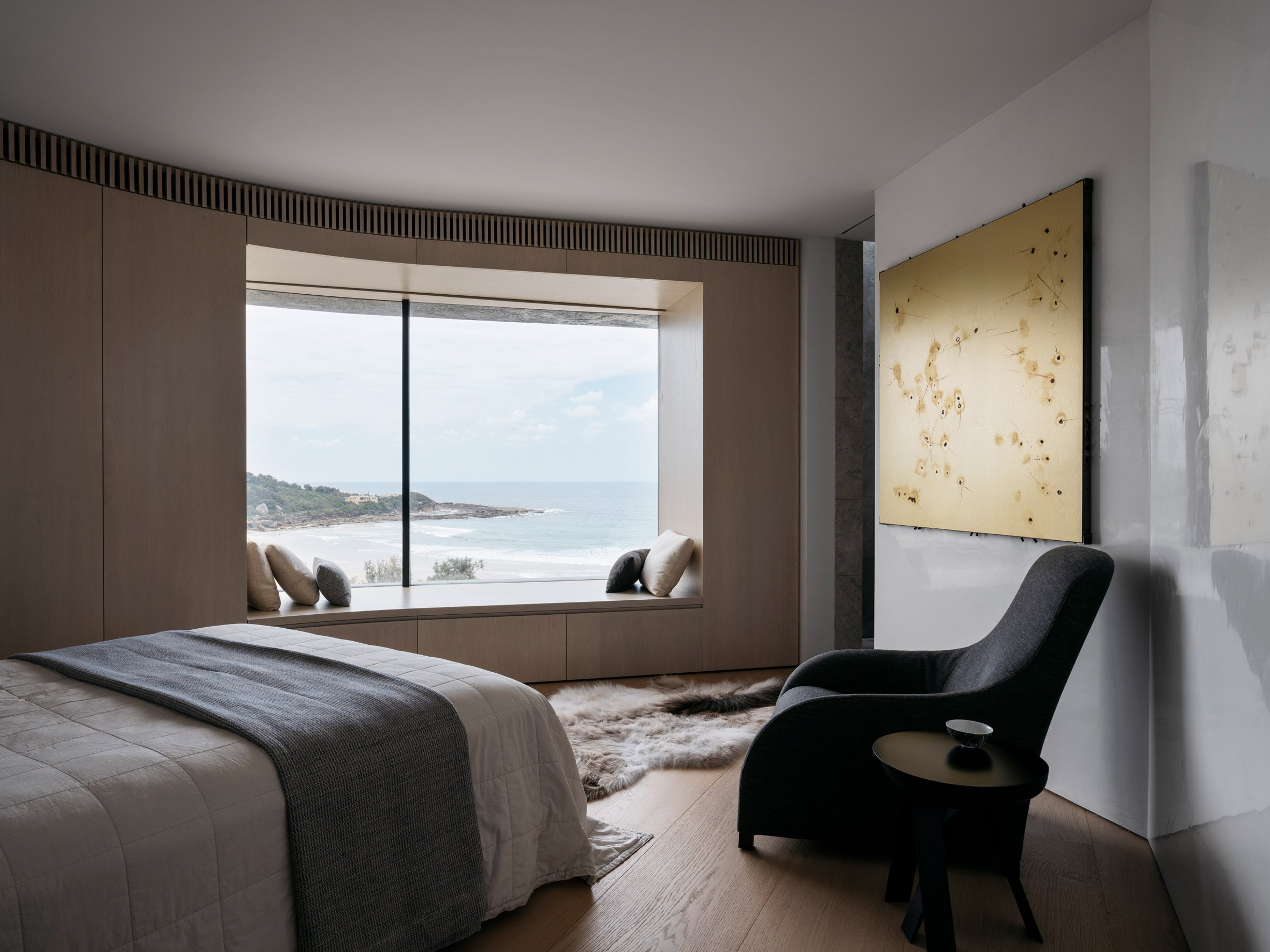 In order to better connect the home's interiors with the surrounding landscape, its new upper storey features a series of deep window reveals, creating a large window box in the bedroom looking out across the beach and sea.