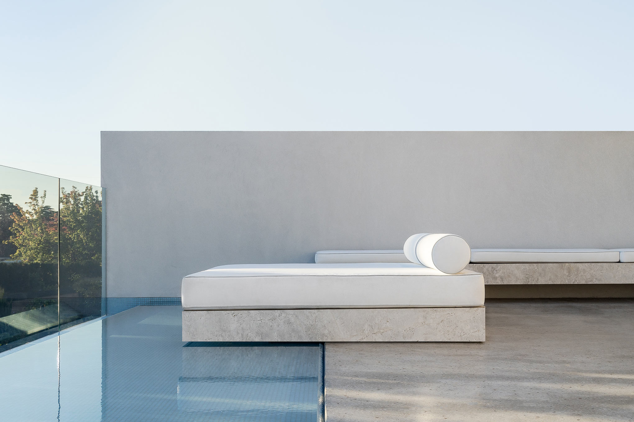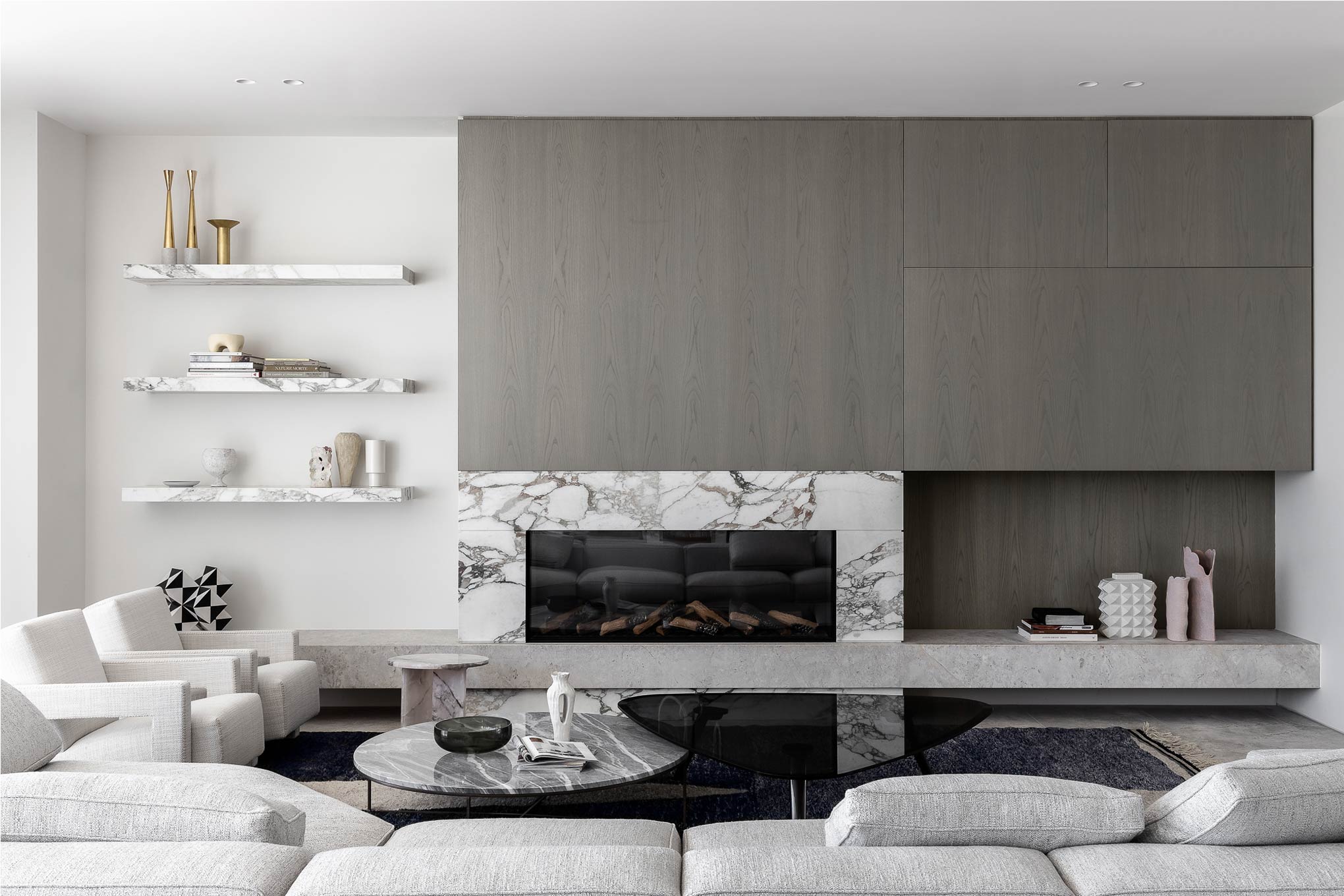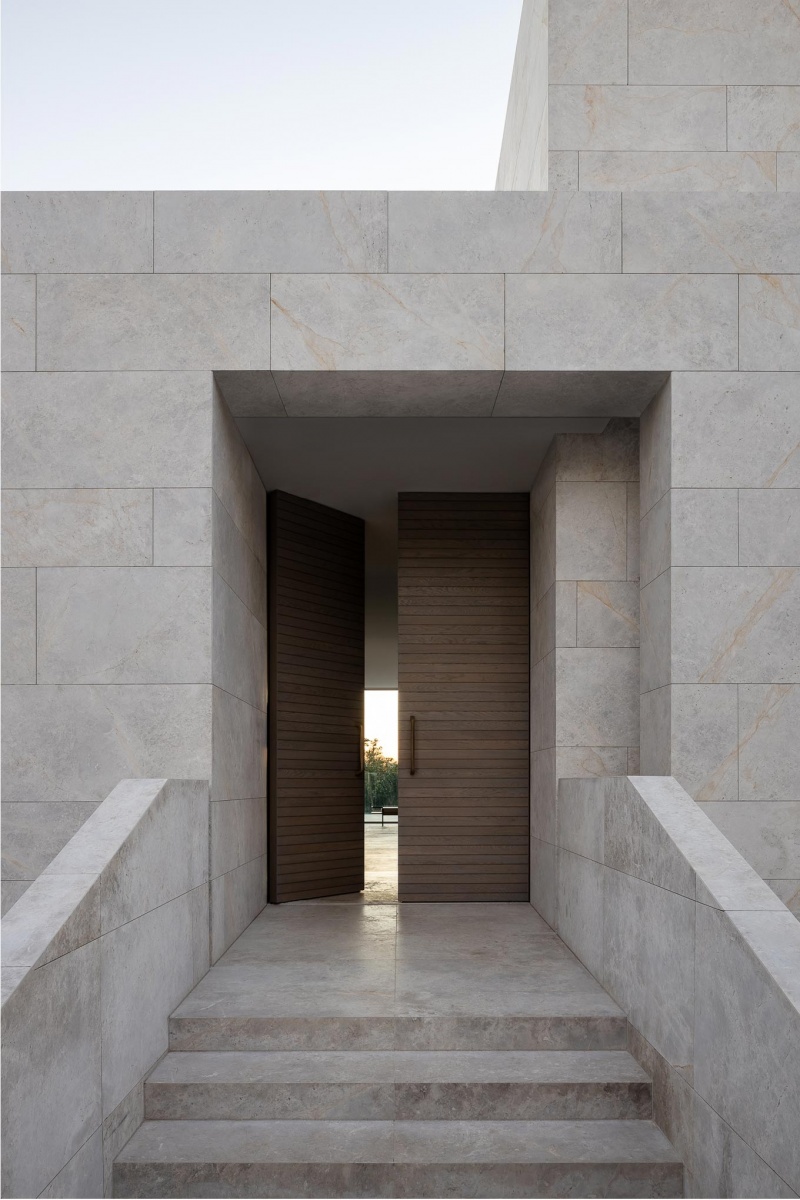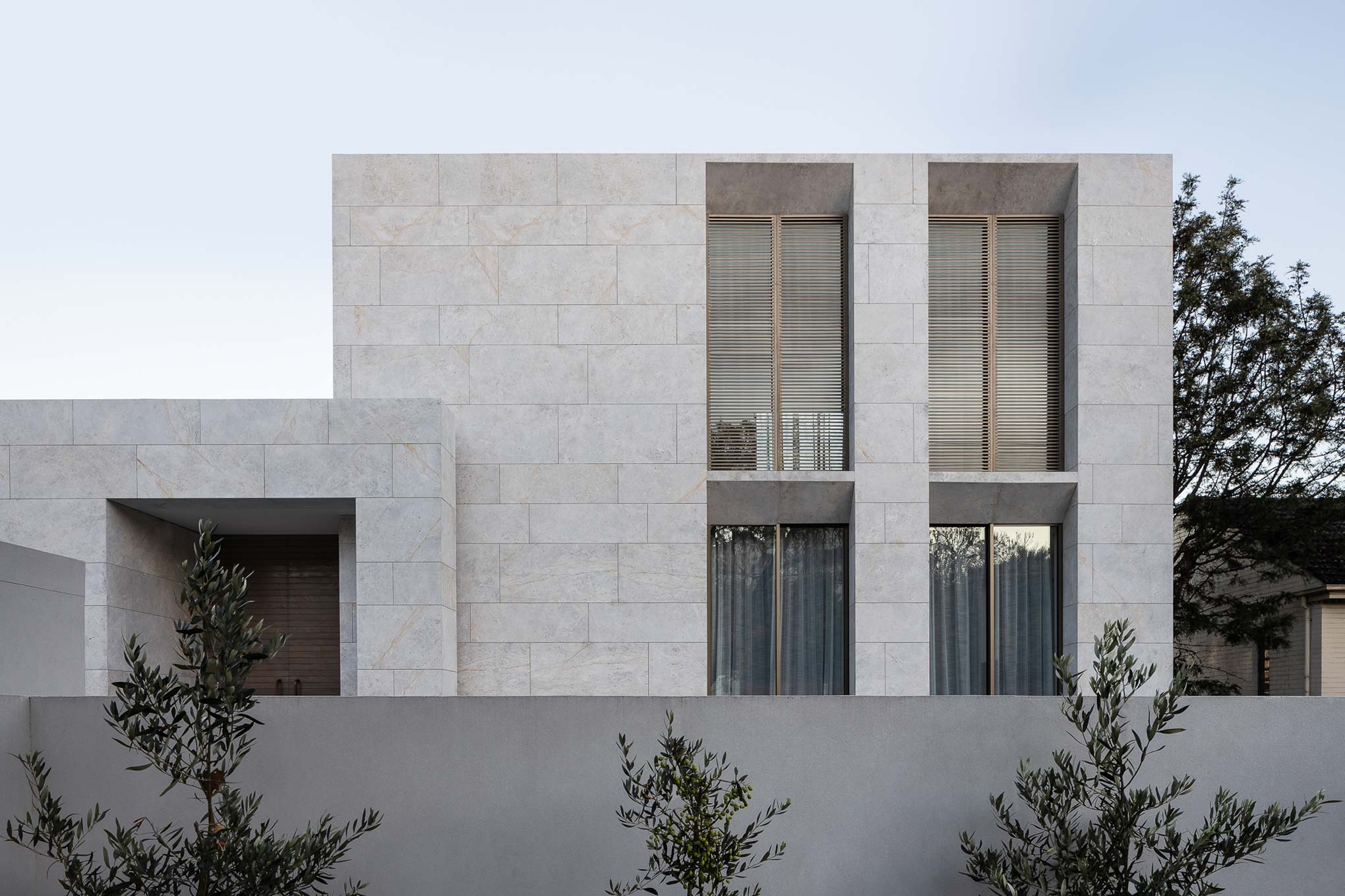 Entry to the home is granted through a gatehouse from the street, where a walled garden creates a sense of privacy and seclusion. The home’s entry floor level is intentionally raised to generate a sense of ‘stepping up’ to a lookout. The acid etched marble of the front façade flows into the interior, intuitively drawing movement through the home’s central spine, across the outdoor terrace and infinity-edge pool, where panoramic views across the city are spectacularly revealed.