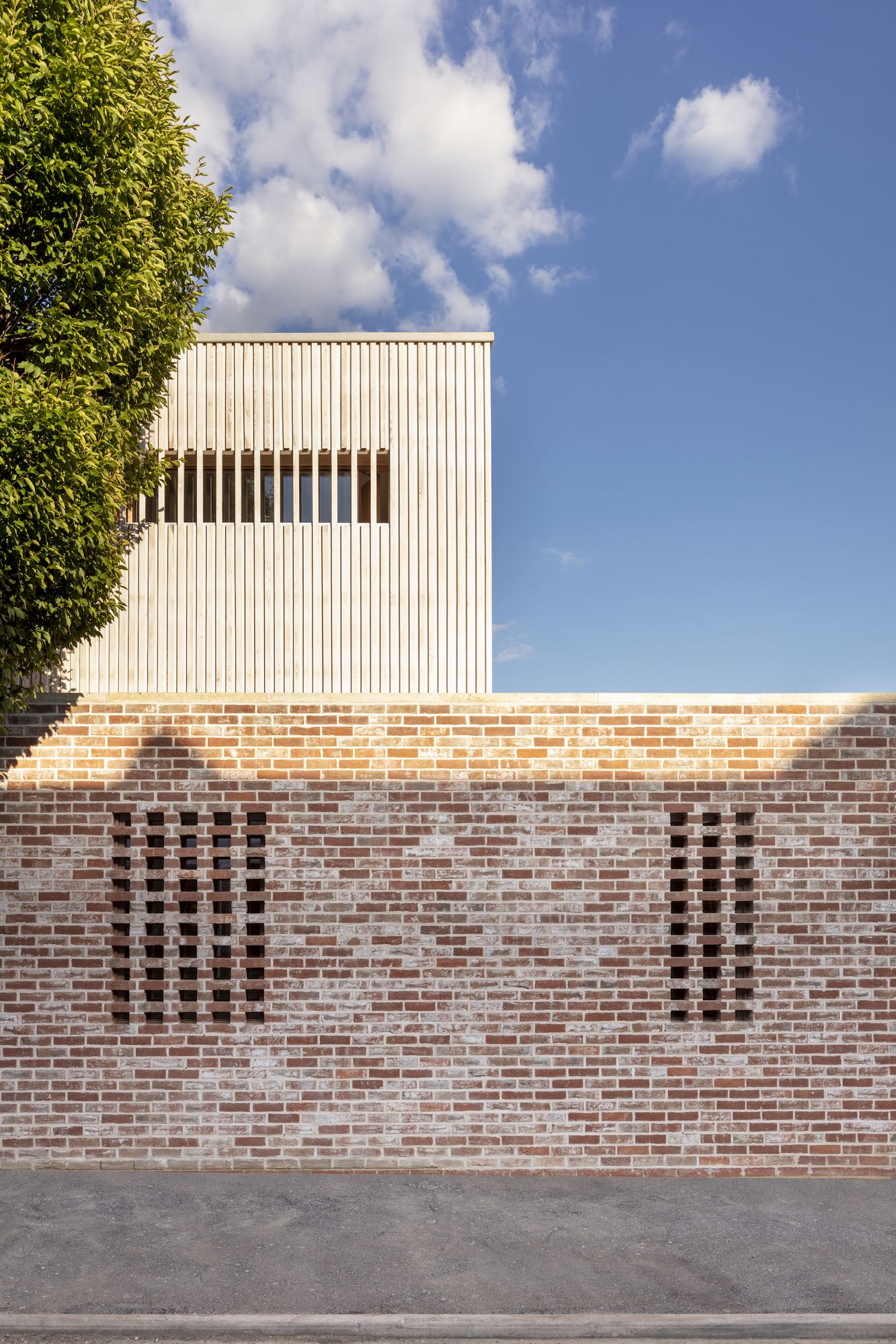Leyton House is a minimal residence located in London, United Kingdom, designed by McMahon Architecture. Leyton House was created to take full use of its urban infill location. The design, which consists of two separate blocks: a monolithic stone plinth and an intricately detailed timber structure above, is characterised by its elemental nature. Two courtyards are constructed around a full length basement below, allowing light to enter the entire design. A sculptural brick chimney that creates a focal point for the bottom floor’s open layout completes the minimalist design. An surprising richness of space and quiet is created with the help of internally exposed architecture and a warm, natural material palette.