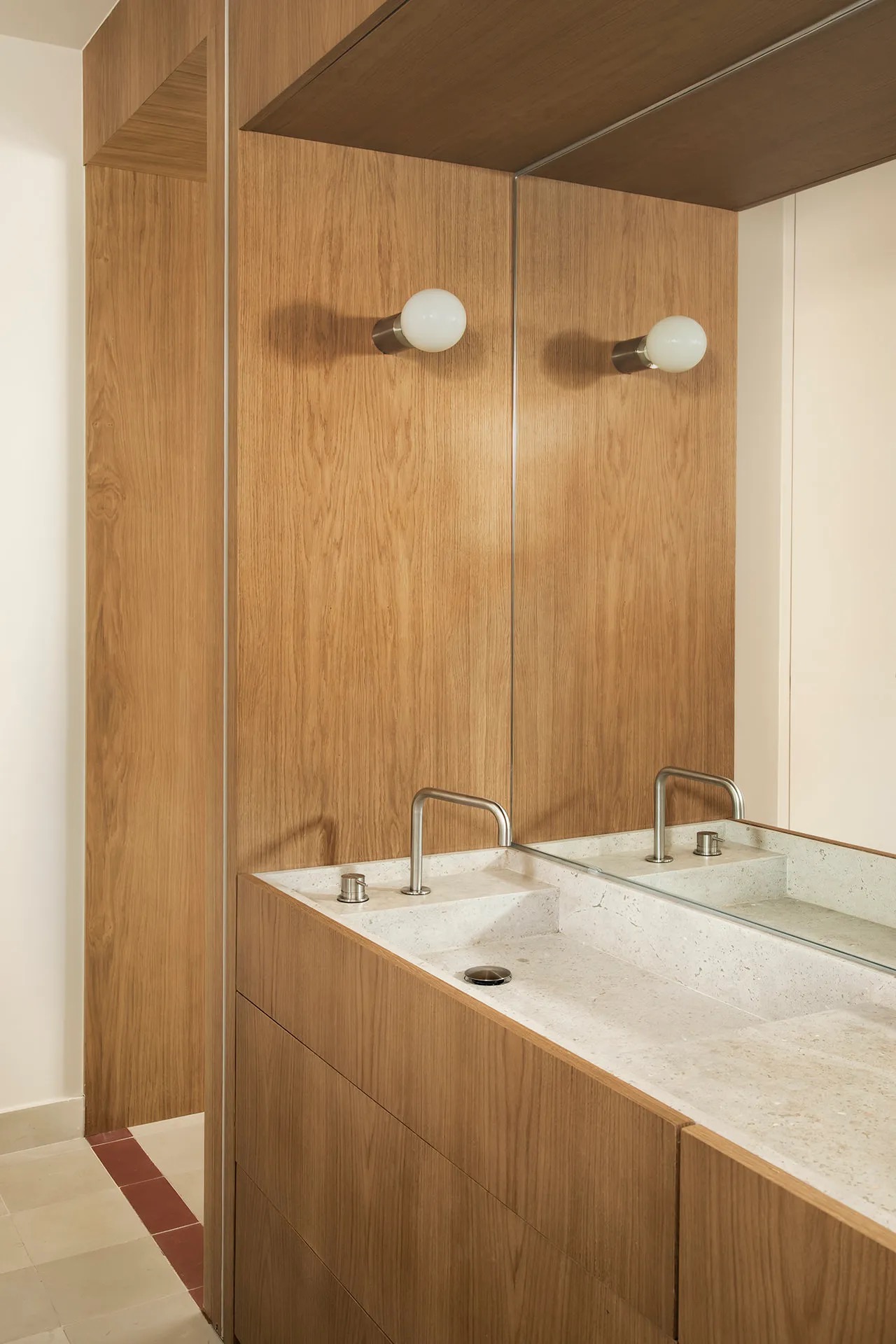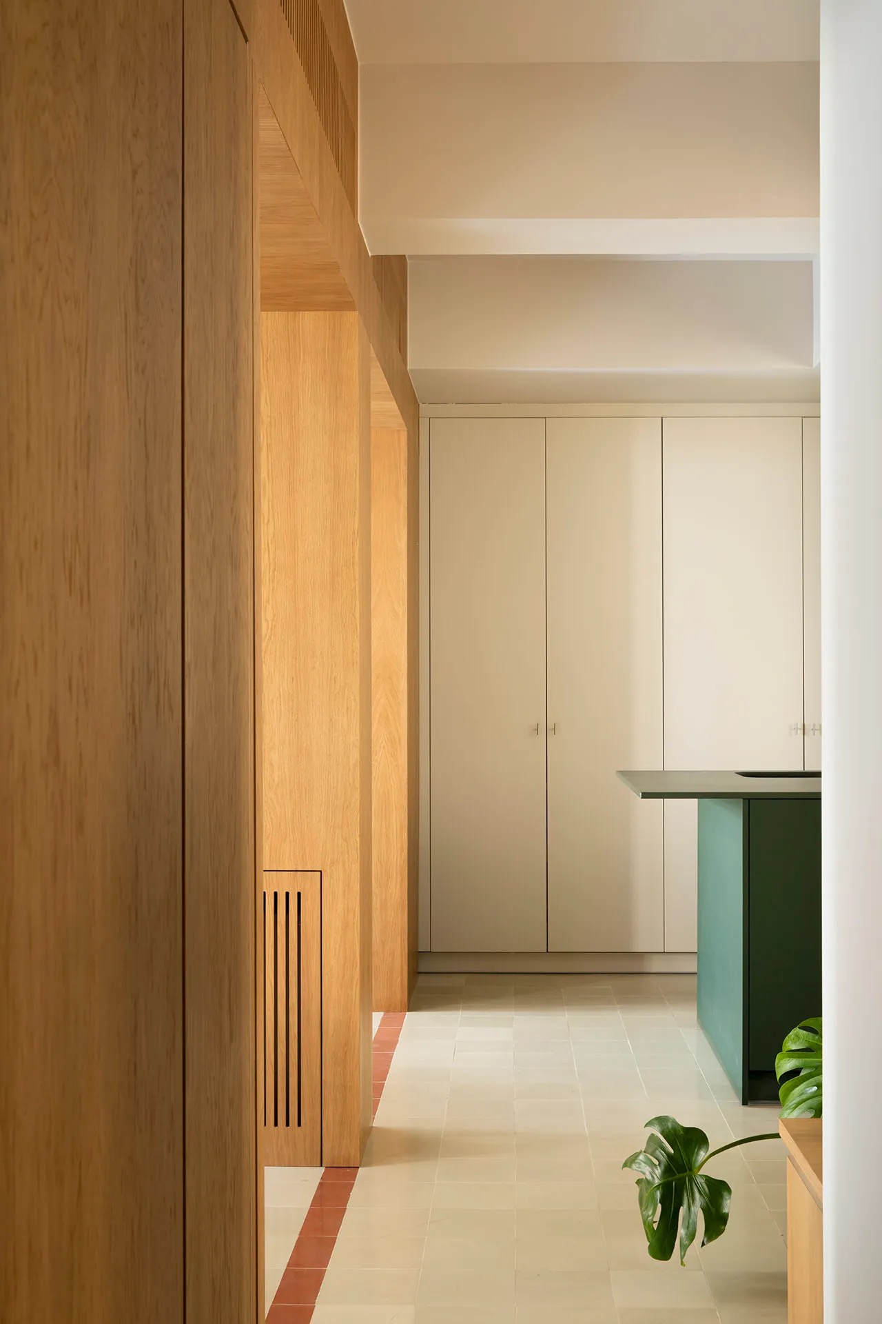 FEC Apartment is a minimal apartment located in Madrid, Spain, designed by Febrero Studio. The Chamberi neighborhood of Madrid has recently seen the completion of a unique apartment renovation project that involved the demolition of the existing structure, save for the original concrete pillars. The designer’s approach involved a central module that would house all the heating and air conditioning installations, as well as the vertical elements of the structure. This wooden module, acting as a multifunctional piece of furniture, serves to expand the living area by accommodating the sofa, conceal access doors to other spaces, act as a divider between the kitchen and living room, and even house the master bathroom sink. To highlight its importance, the module was crafted mainly from wood, which also helps to enhance its volume and define its shape within the pavement. Despite the need to replace the worn hydraulic tile floor, the designers opted to maintain the same style of flooring throughout the entire apartment, given its original type and the period in which it was constructed.