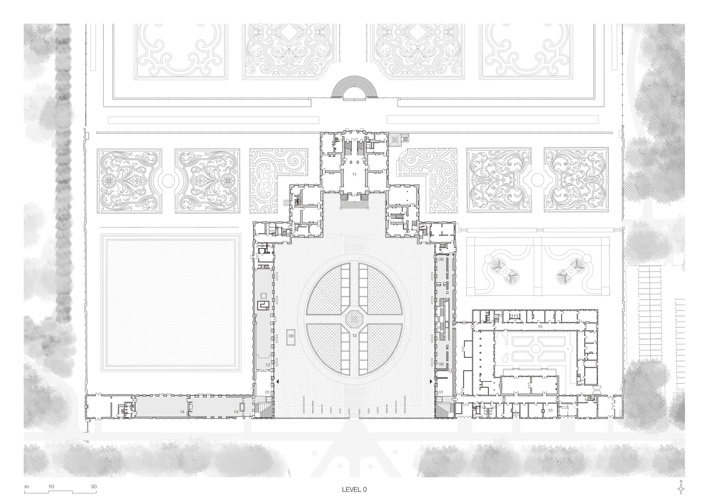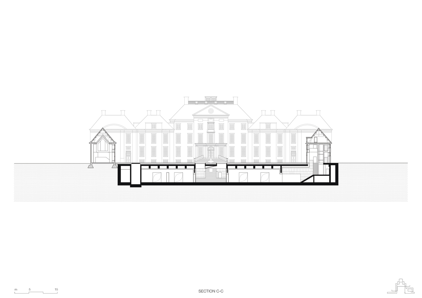 Paleis Het Loo was initially constructed in 1686 as a royal hunting palace for King William III and Queen Mary on the outskirts of Apeldoorn. The property's ample forest grounds and necessary underground water pressure created ideal conditions for a baroque composition of lush gardens punctuated with numerous water features and a monumental palace at its base. KAAN Architecten's intervention draws from this inextricable connection between architecture and the landscape. The entire extension is placed underground, and the new water feature is integrated as part of the architecture, continuing the tradition of the overall composition without disrupting the historical image.
