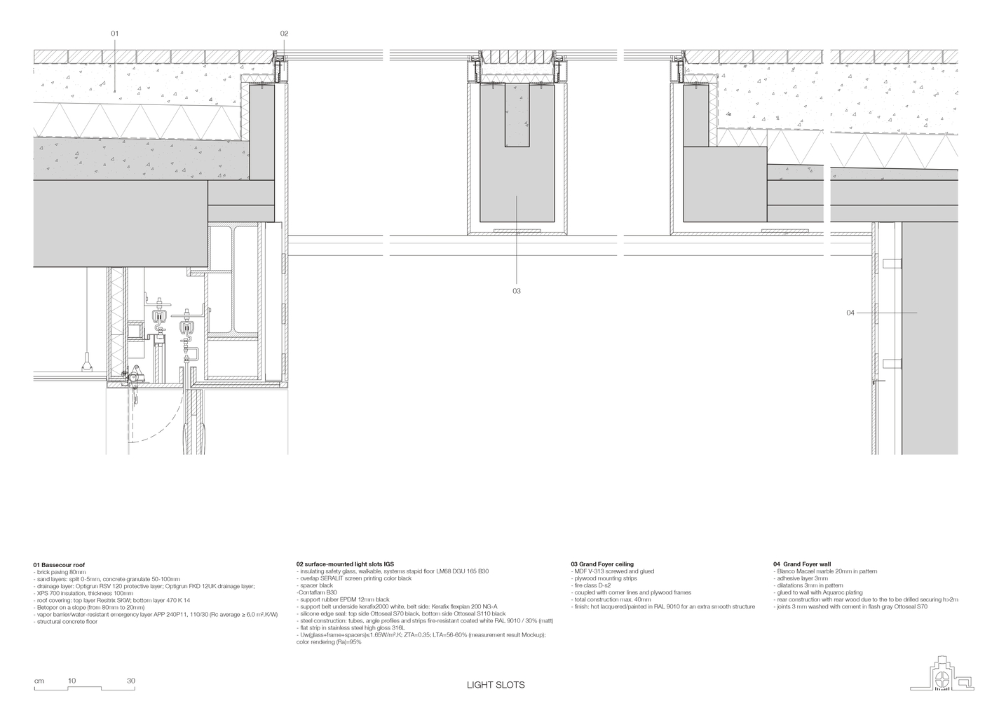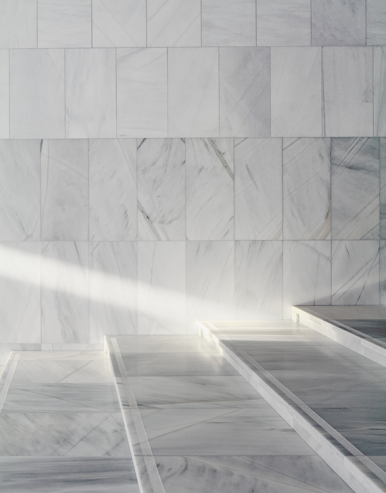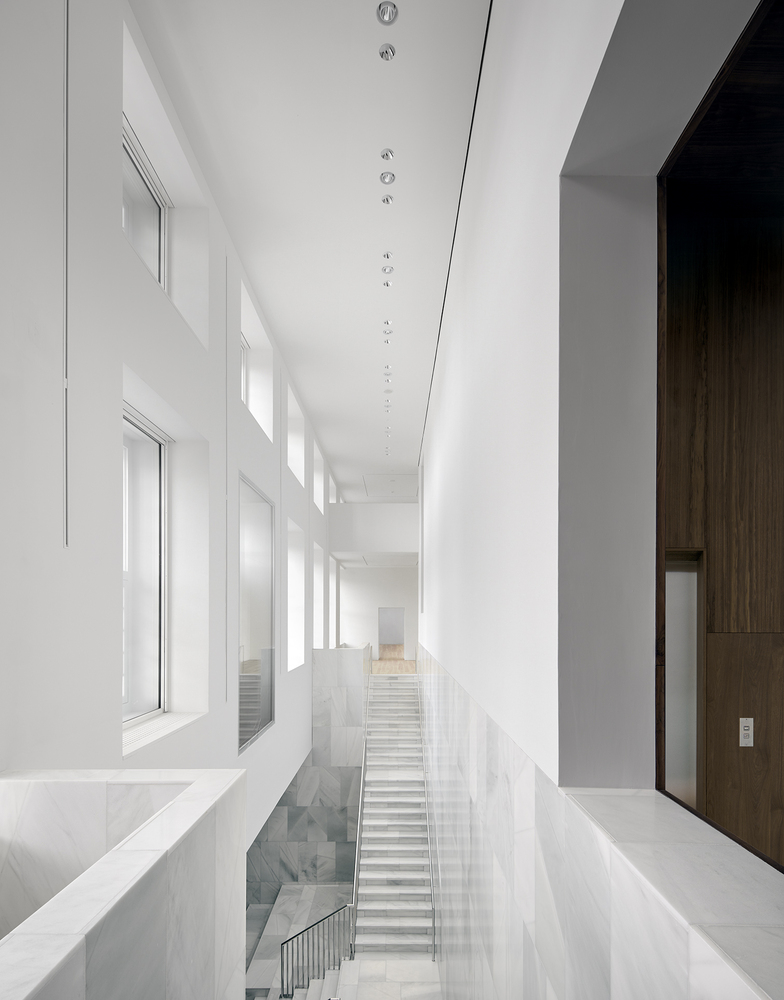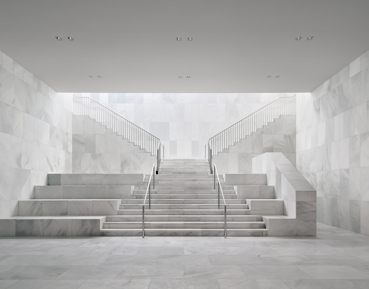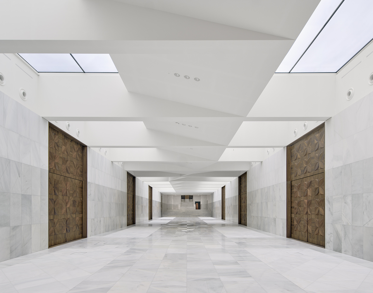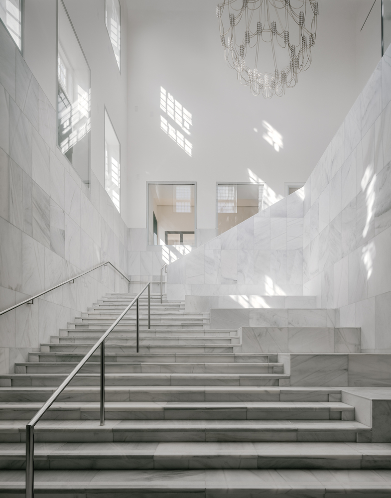 Rather than creating a prominent entrance that could encroach on the open Bassecour, the entry points have been positioned at the ends of the palace wings. Traces of the past remain visible in the subtle marble inlays on the walls where the old structure was hollowed out to create the lantern-like entry pavilions. Visitors are guided down to the light filled balcony, which hosts all necessary visitor facilities and leads into the Foyer.