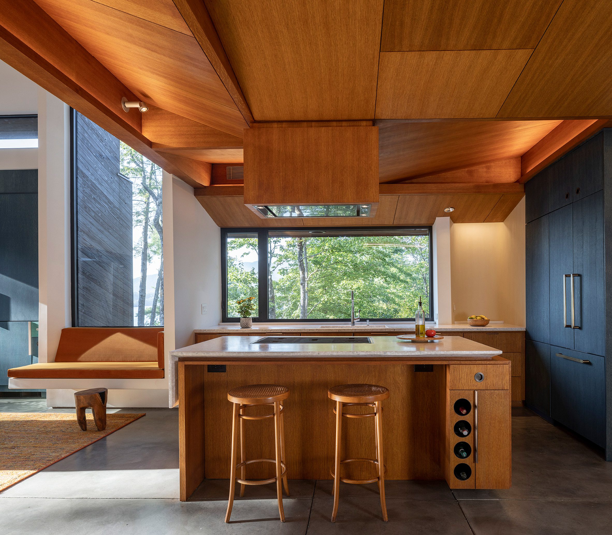 On the exterior, the individual forms are wrapped in dark charred cypress and a patinated, standing seam zinc roof that reflects the browns, greens and greys of the forest and lake and are intended to weather over time.