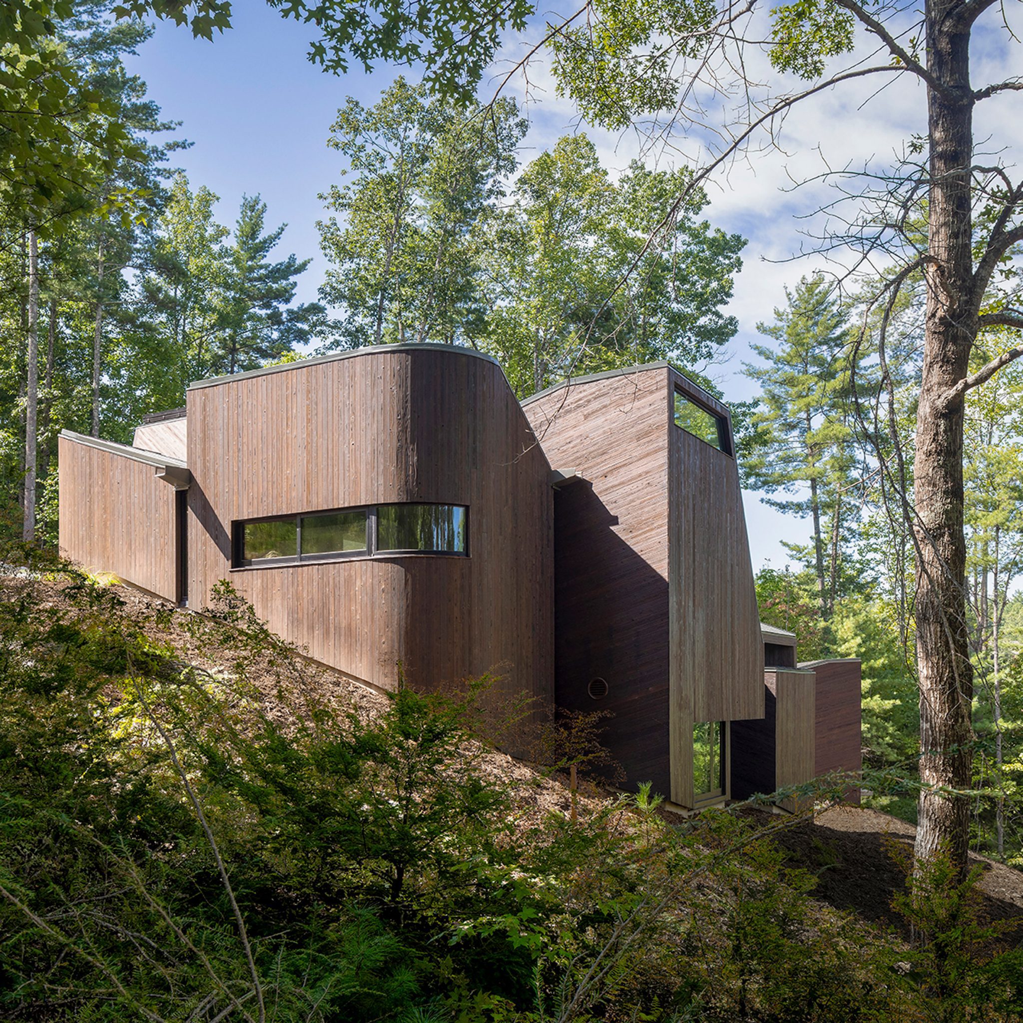 New York based studio Fuller Overby has created a North Carolina home clad in charred cypress that cascades down a hill to a lake in North Carolina.