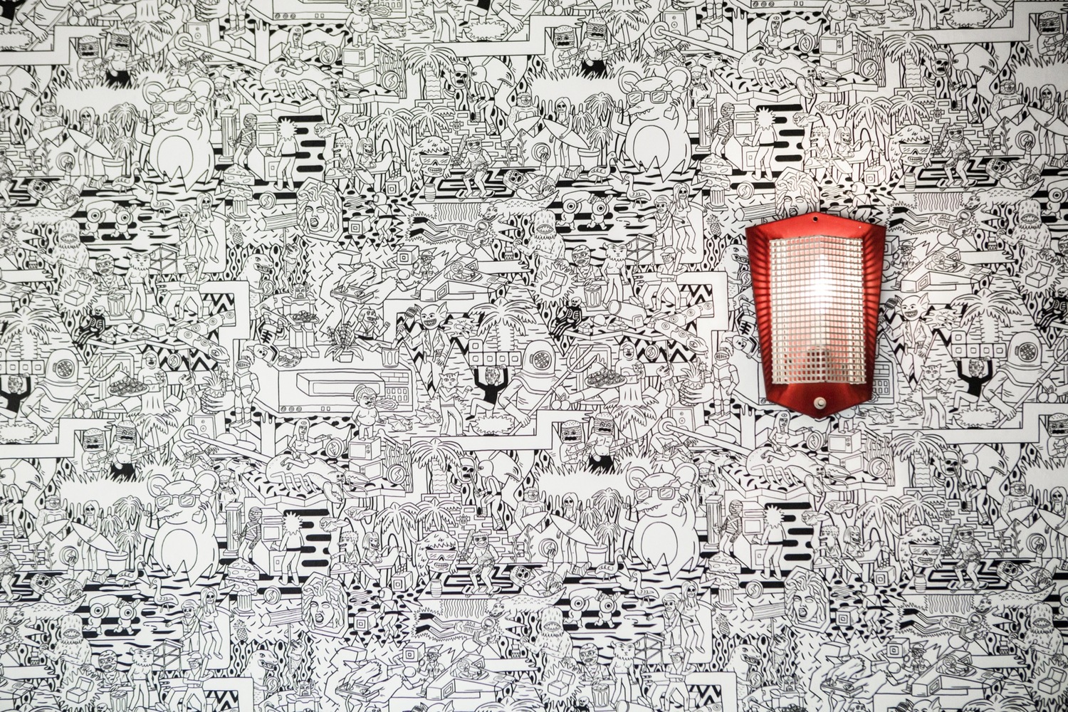 The bold exterior paint color is historically common in the neighborhood where a variety of bright spots punctuate this stretch of Sunset Boulevard. A kaleidoscopic journey through layers of transparency, reflectivity and pattern pull you in through a portal cut into the strip mall’s exterior, past the hand painted Talavera tiles and round window that bring visitors into an otherworldly tunnel filled with a dense custom wallpaper by artist Joseph Harmon.