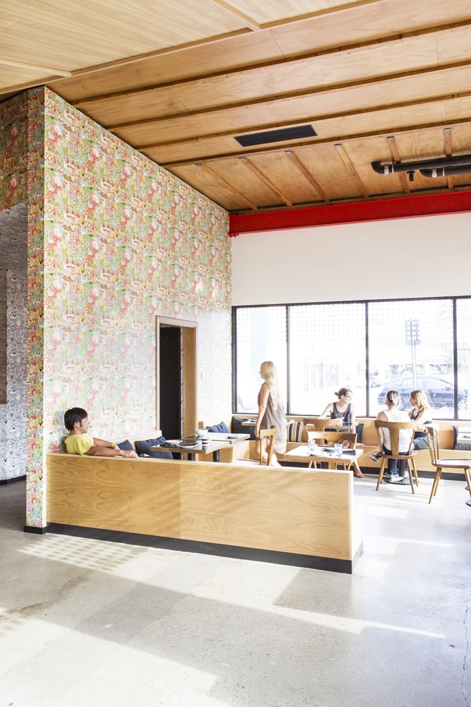 On the interior banquettes are covered with camel colored vinyl and plywood paneling; smokey mirror, marmoleum, and dark brown are all nods to the noir mystique and a contemporary version of police academy haunts of the past. Interior details reflect a mash-up of both local real and fictionalized influences juxtaposing post modern laminate with brass foot rails, marmoleum and oak wood paneling, and vermilion powder coated steel with camel colored vinyl. Unusual material exploration is playfully scattered throughout the space from painted battens on wood paneling, hand-painted artwork to pyramidal acoustic foam and 3D coffered ceiling patterns made of homosote.