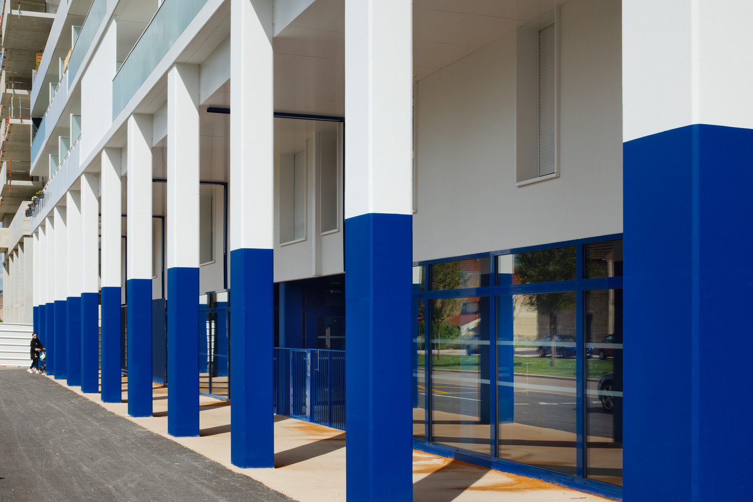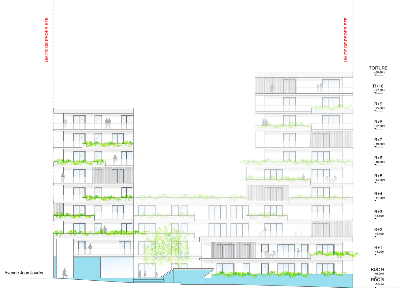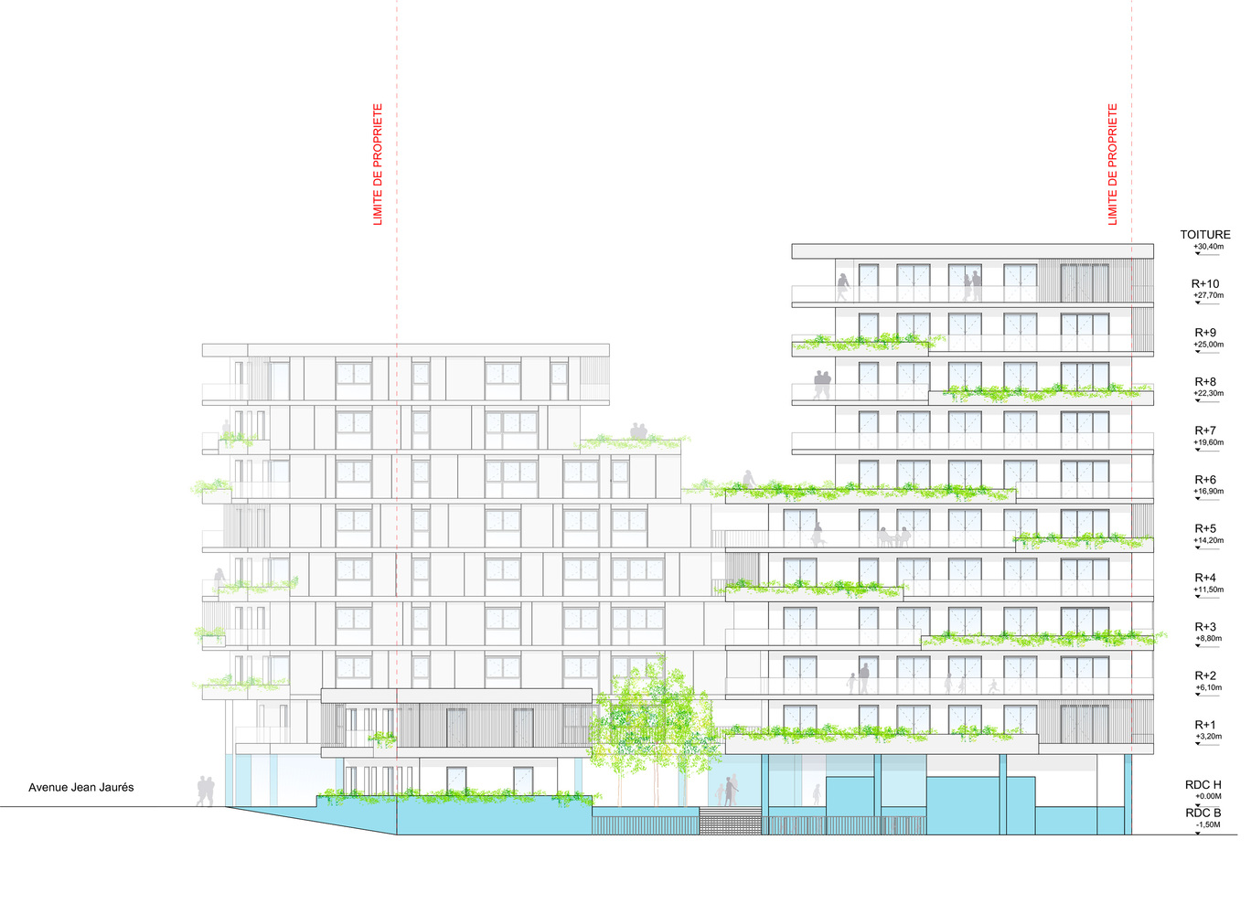 The ground floor’s transparency links Avenue Jean Jaurès and the eco district that develops towards the east. This creates views in several directions, all the way to the communal courtyard that opens onto the future community building, which will be constructed at the same level as the “Halle de l’Etarmat.”