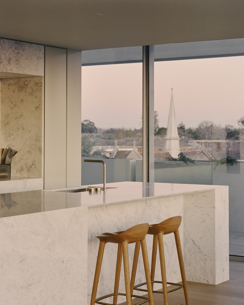 The façades to the east and south are highly refined and detailed, while those to the north and west gradually step back, wrapping around and dissolving the form with the use of the framing. The effect is calmness through consistency and balances through repetition. Through lush planting, Acre worked to find ways to soften the rectilinear grid of the building, while offering each apartment an aspect of green. They achieved this by designing climbing structures that over time will see greenery climbing and draping from the large gridded façade. This is a building that breathes. The pinnacle is the soaring 13-meter void in the center, clearing a vertical pathway for the private residential lobby. As each level recesses, the building is punctuated by clear glazing offering sweeping views across Armadale over the city skyline. In doing so, large terraces reveal gardens and open spaces to further soften the distinctive exterior.