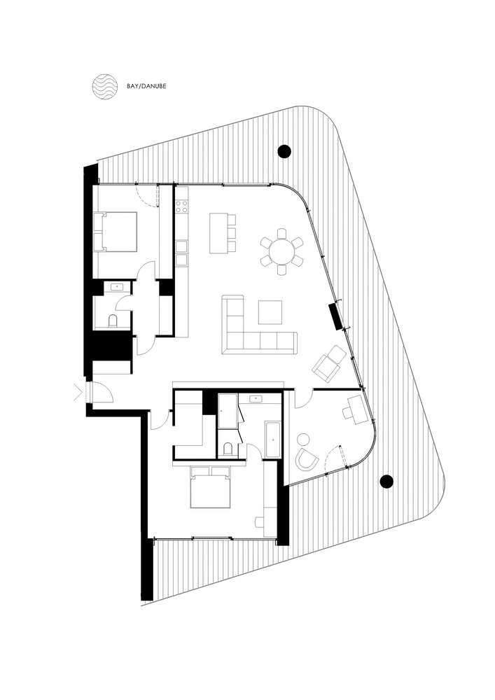 Concept. The architectural concept was first approached from an urban point of view, mapping scale and mass and urban connections. The aim was to design not just a condominium with an attractive façade, but a building that could be viewed from multiple angles and distances, responding to both the natural and built urban environment with equal detail. As a solution, a building volume consisting of two connected superstructure parts was created, which on the one hand follows and exploits the strange geometric features of the site and on the other hand reacts dynamically to the adjacent mass of the National Swimming Centre.