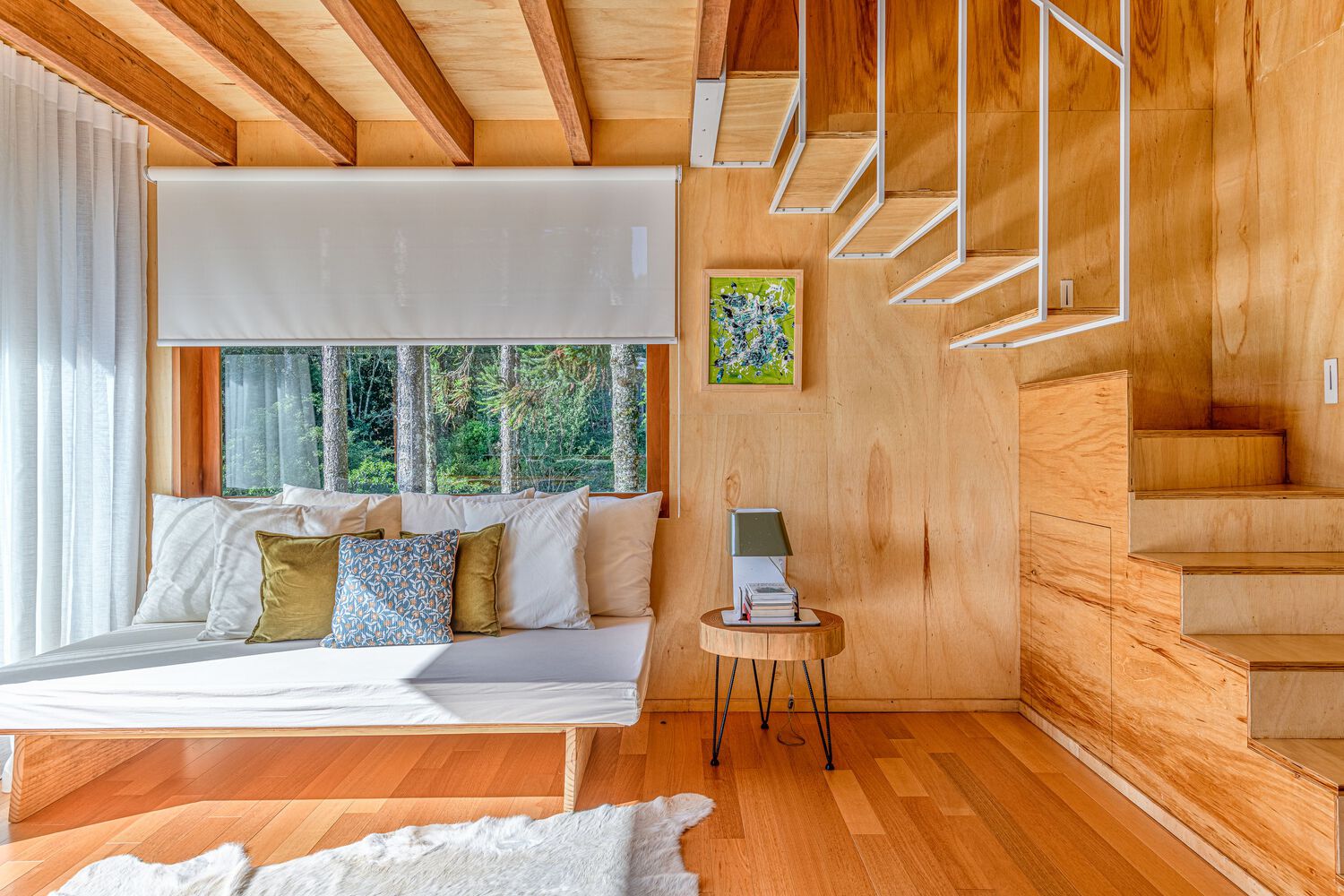 The entire external part of the house is covered with cider eucalyptus wood painted with a black stain, which despite being heavier, is a color that makes the house very integrated with nature, contrasting with the internal part of the house. house, which is very light, and soft. The internal lining material is marine plywood, a pine that recalls minimalist Scandinavian architecture. An environment built with little diversity of materials. The contrast of the dark outside and the light inside is a very pleasant surprise for guests.