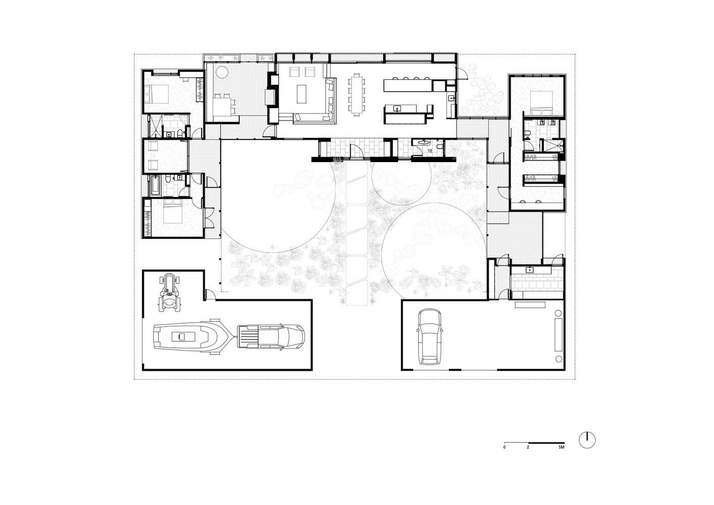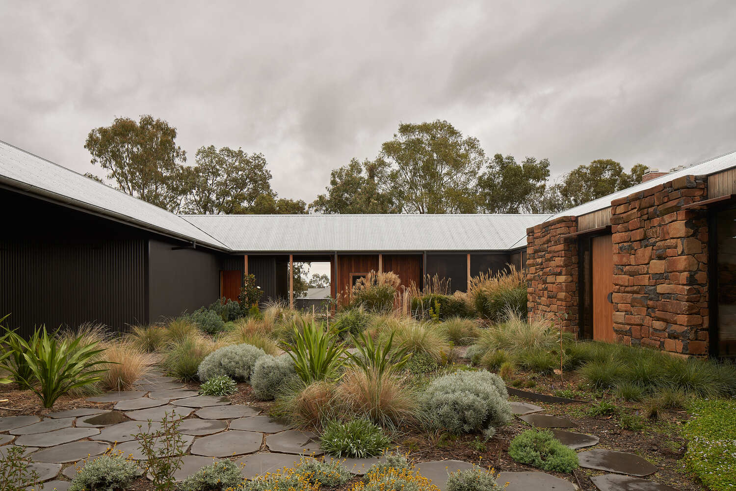 This part of Australia is prone to drought, and it was during drought that we first visited the site, which was dry and dusty, with only a few yellow plants clinging to life. This meant that the design of the house was focused not only on regenerating the land and creating a garden but also on resisting drought conditions in the future. The creation of an almost totally enclosed courtyard garden in the center of the house was one way of dealing with this. At the front of the properties, two sheds connected by a roof also connect to the house on either side, forming a square around this central courtyard.