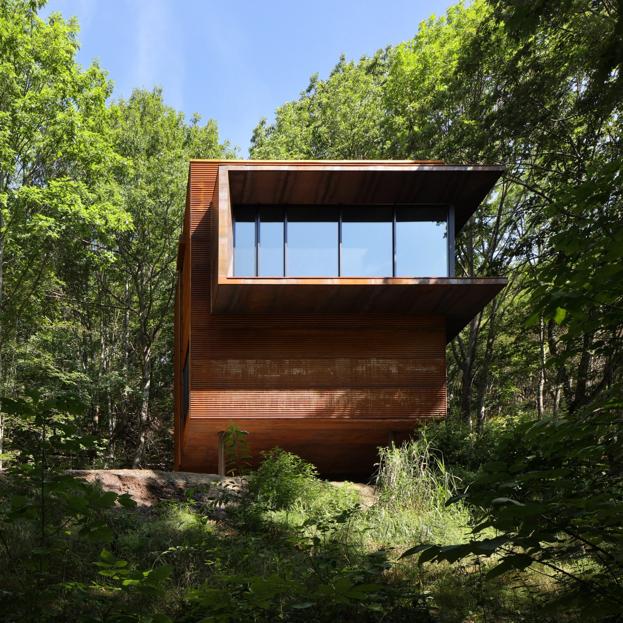 The cabin's form – a large corrugated Corten steel box atop slender columns is reminiscent of a duck blind. The smooth weathering steel entry is recessed underneath the volume next to a covered gravel patio.