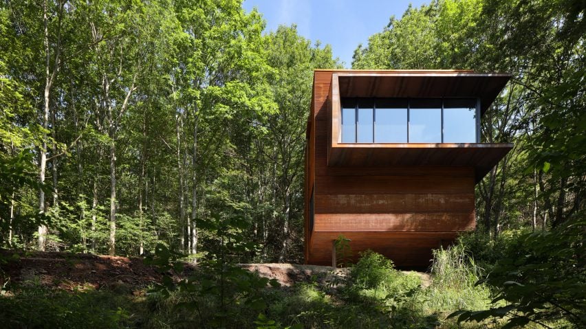 Canadian studio Omar Gandhi Architects has wrapped an elevated cabin in Corten steel on a forested hillside in Nova Scotia.