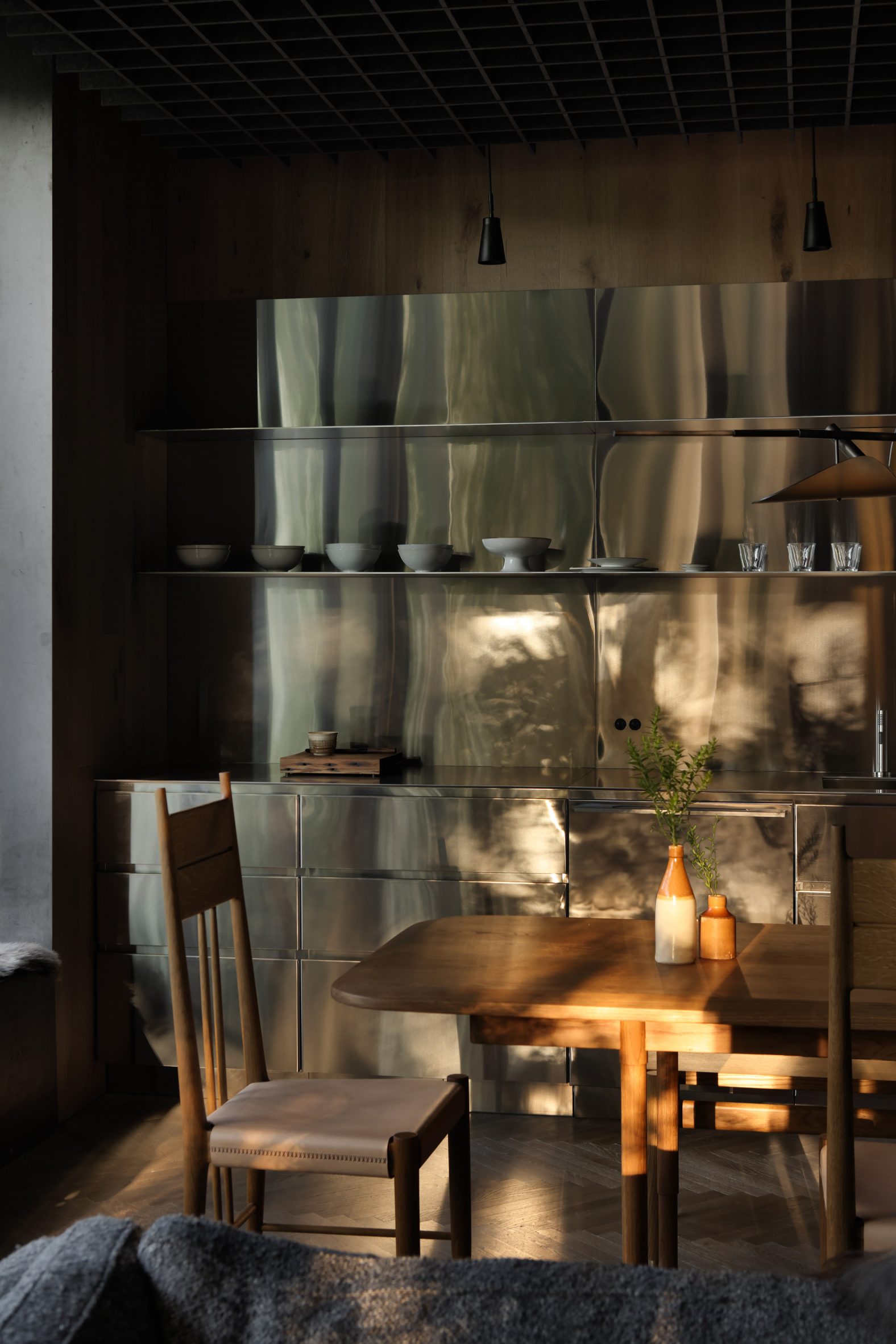 "Smoked oak interiors, complemented by raw steel shelving and wall mounted industrial light fixtures, create a soothing atmosphere," the studio said.