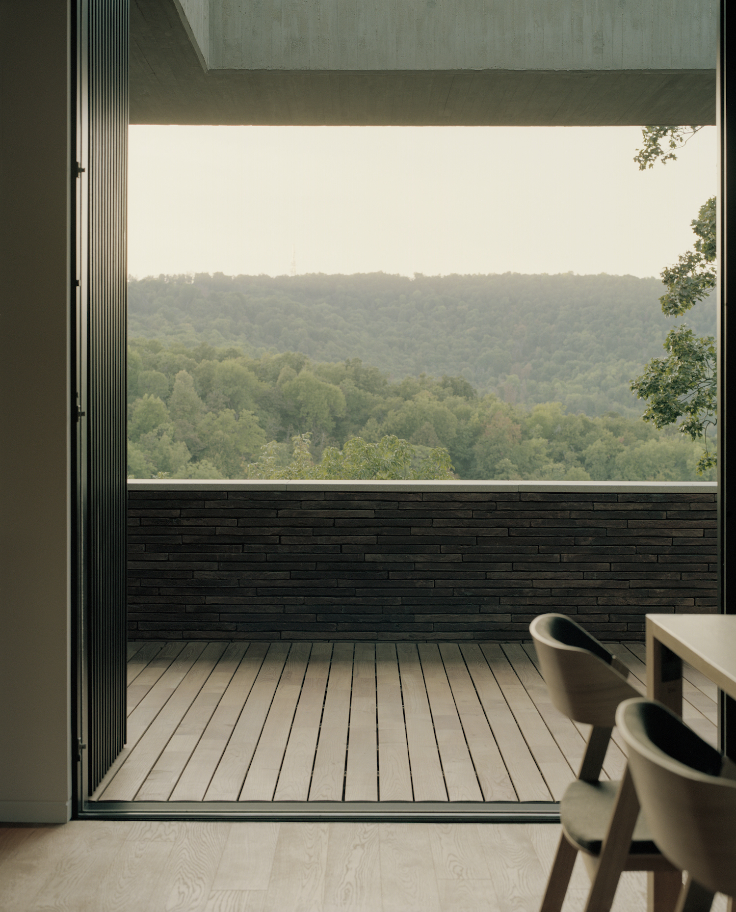 The façade juxtaposes the solidity of structural concrete with elongated, rust colored brick cladding that’s ventilated for durability. Complementary black-painted wood paneling adorns the retracted surfaces near the green roofing, while black aluminum is chosen for doors and windows. The roof itself is finished with dark gray sheet metal. Internally, the design continues the theme of material duality, with exposed concrete beams and the wooden roof structure defining the space, allowing for minimalistic interior accents that enhance the architectural features. The design is orchestrated to create harmony between the interior and the exterior, with landscape vistas, internal gardens, and structural elements framed by large openings. The interior details are crafted to resonate with the exterior, fostering a subtle dialogue between the two.