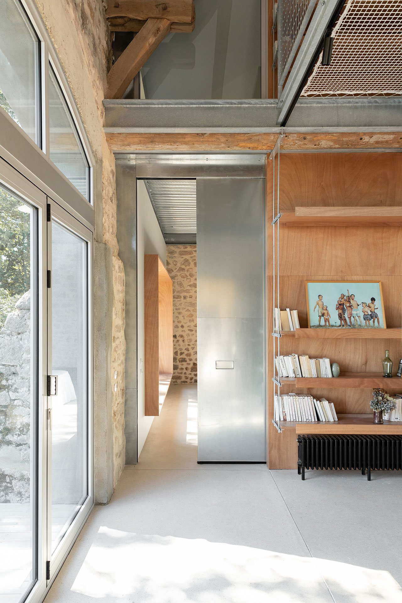 At the heart of the renovation is a metal and wood structure that has been surgically inserted into the building in such a way as to not disturb the original masonry walls and timber beams. The structure divides the space into a generous living room and a private area with two bedrooms on two levels, while also functioning as a support framework for an array of furnishings such as suspended shelves, luminaires, railings, sliding doors and even a hanging net suspended above the living room.