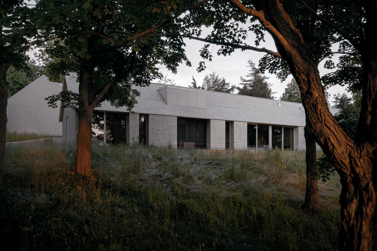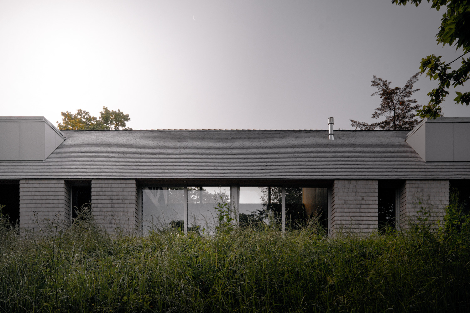 Cherry Valley is a minimal house located in Prince Edward County, Canada, designed by StudioAC. This area is renowned for its complex coastline and emerging wine industry, with a landscape that primarily features fields and shorelines. Cherry Valley is positioned on a site that encompasses both a meadow like plateau at its entrance and a ridge leading down to the lakeshore. The house is strategically placed just below the tree canopy, on a natural ridge offering shelter from the wind and views of the lake, framed by trees. The design of the residence integrates it into the ridge, with the rear protected and the front offering views from beneath the tree line. The house features large windows facing the lake, and ground-level panoramic windows overlooking the meadow.