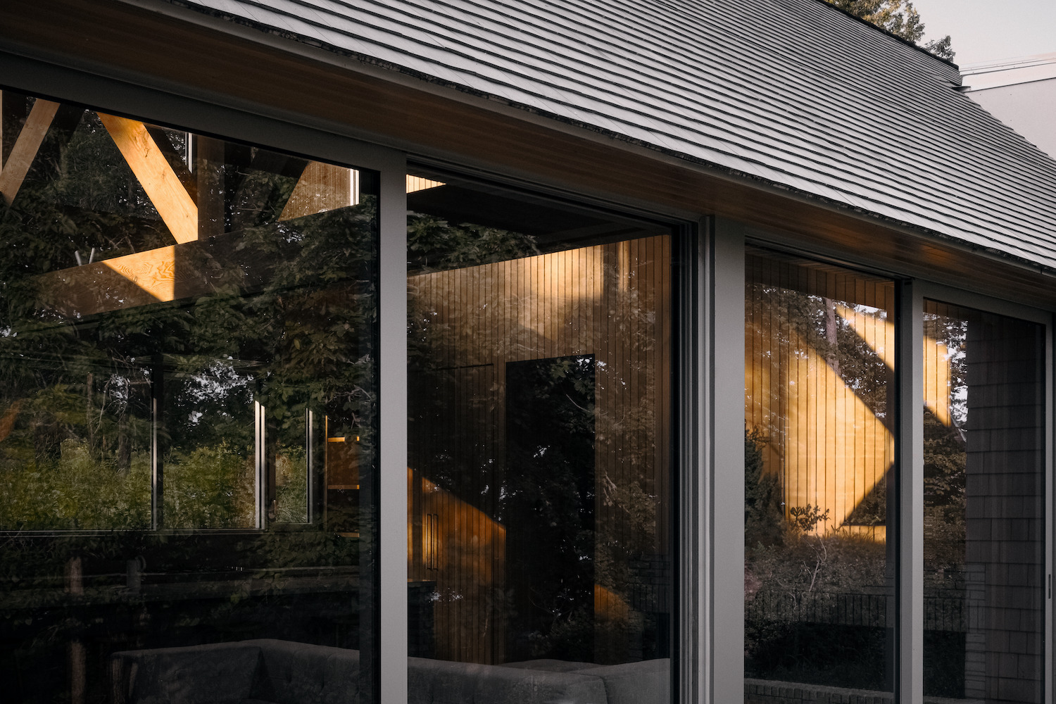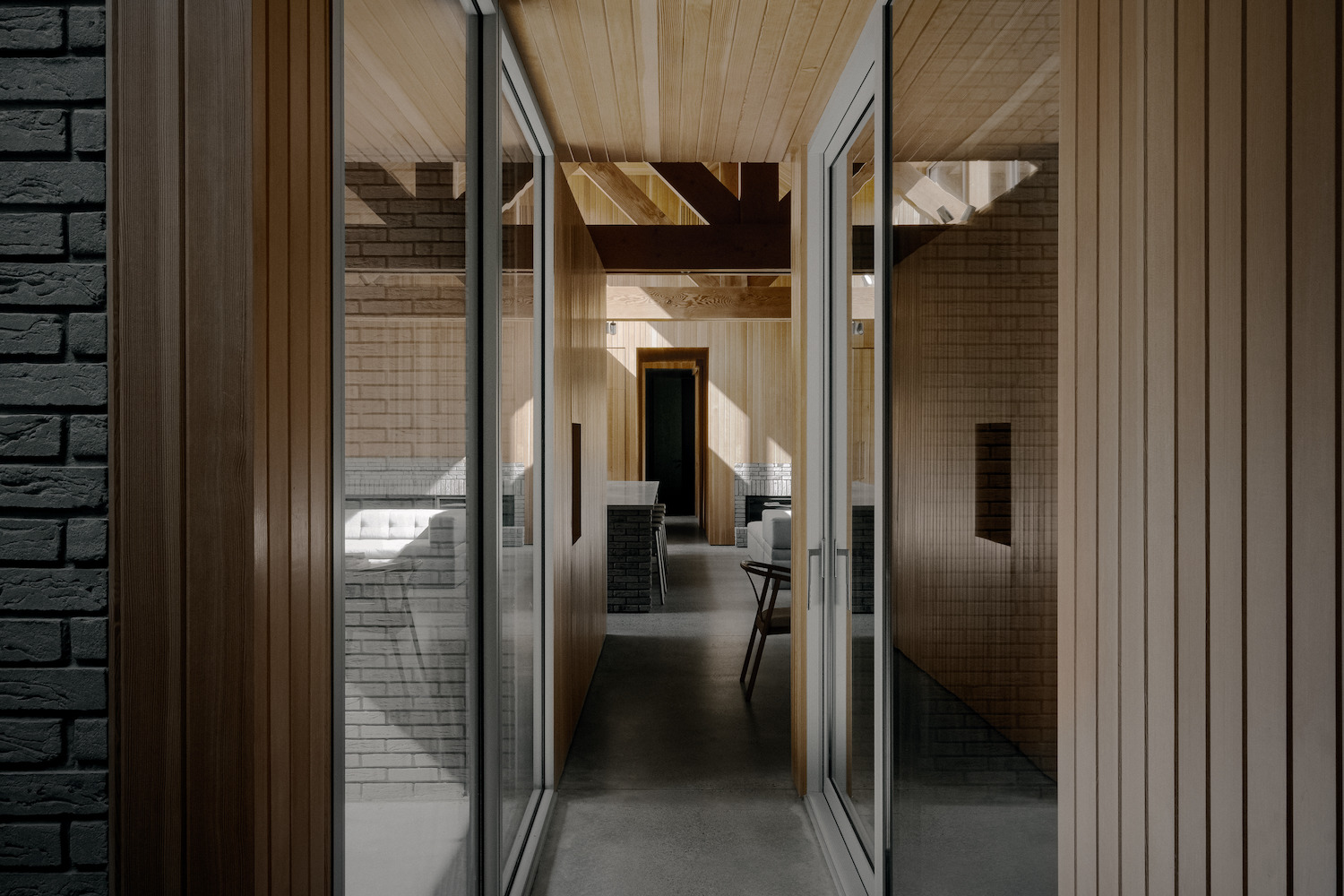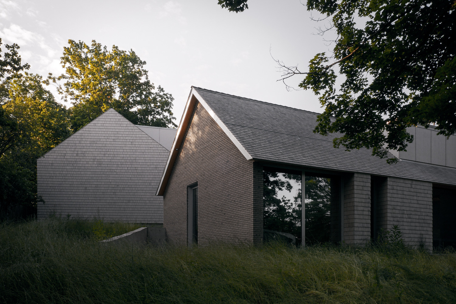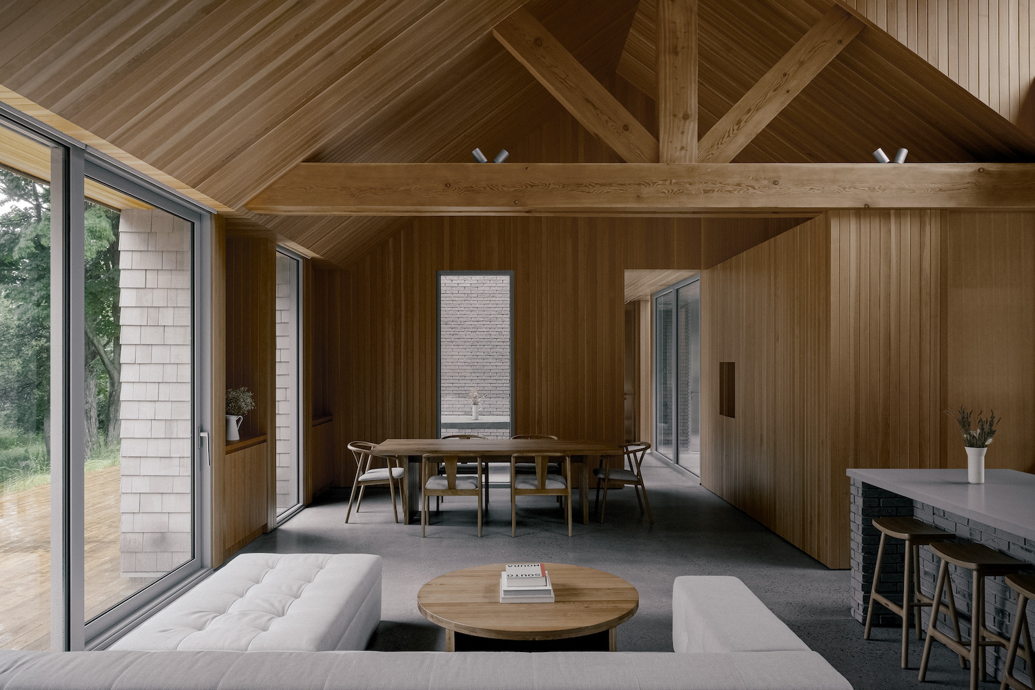 These windows provide an immersive view of the surrounding nature, from the ground up to the sky. The design also includes larger dormers that enhance natural light, replicating the effect of sunlight filtering through tree canopies. The architectural style and materials of Cherry Valley draw on the local agrarian architecture. The use of brick and cedar reflects the dual nature of the site: brick forms the solid wall against the hillside, while cedar extends down the facade facing the water, complementing the surrounding trees. Inside, the walls and surfaces are clad in Douglas fir, with brick elements that echo the exterior design. This blend of materials and the strategic siting of the house create a dialogue between the building and its natural surroundings, making Cherry Valley a notable example of contemporary residential architecture that respects and enhances its setting.