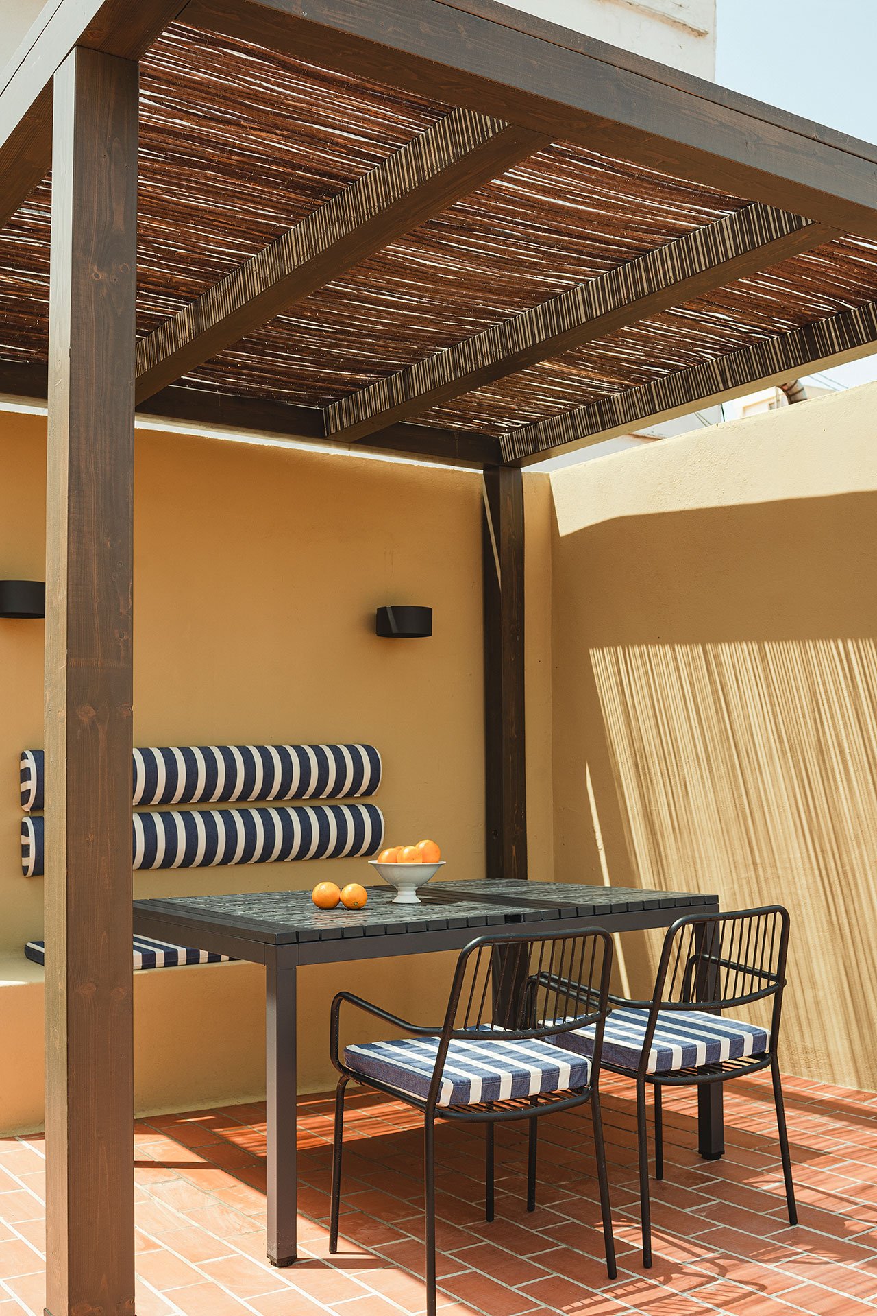 On the ground floor, an open plan layout connects a living area at the front of the house to a small courtyard at the back via the kitchen/dining area complete with a timber structure housing a compact bathroom subtly incorporated into the kitchen area. This configuration imbues a sense of spaciousness while enabling cross-ventilation and increasing natural light entering the house. A similar timber structure housing the bathroom can also be found on the upper level, nestled between the two bedrooms. Featuring a custom-designed, free-floating vanity unit, the bathroom is accessed via repurposed glass and wood doors, which now function as sliding panels. Connecting the two floors, as well as a small rooftop where the team has installed a wooden gazebo, the building’s original staircase encapsulates the building’s redesign, with the old granite steps intermingling with salvaged black terrazzo tiles and the new white and blue checkerboard tiling.