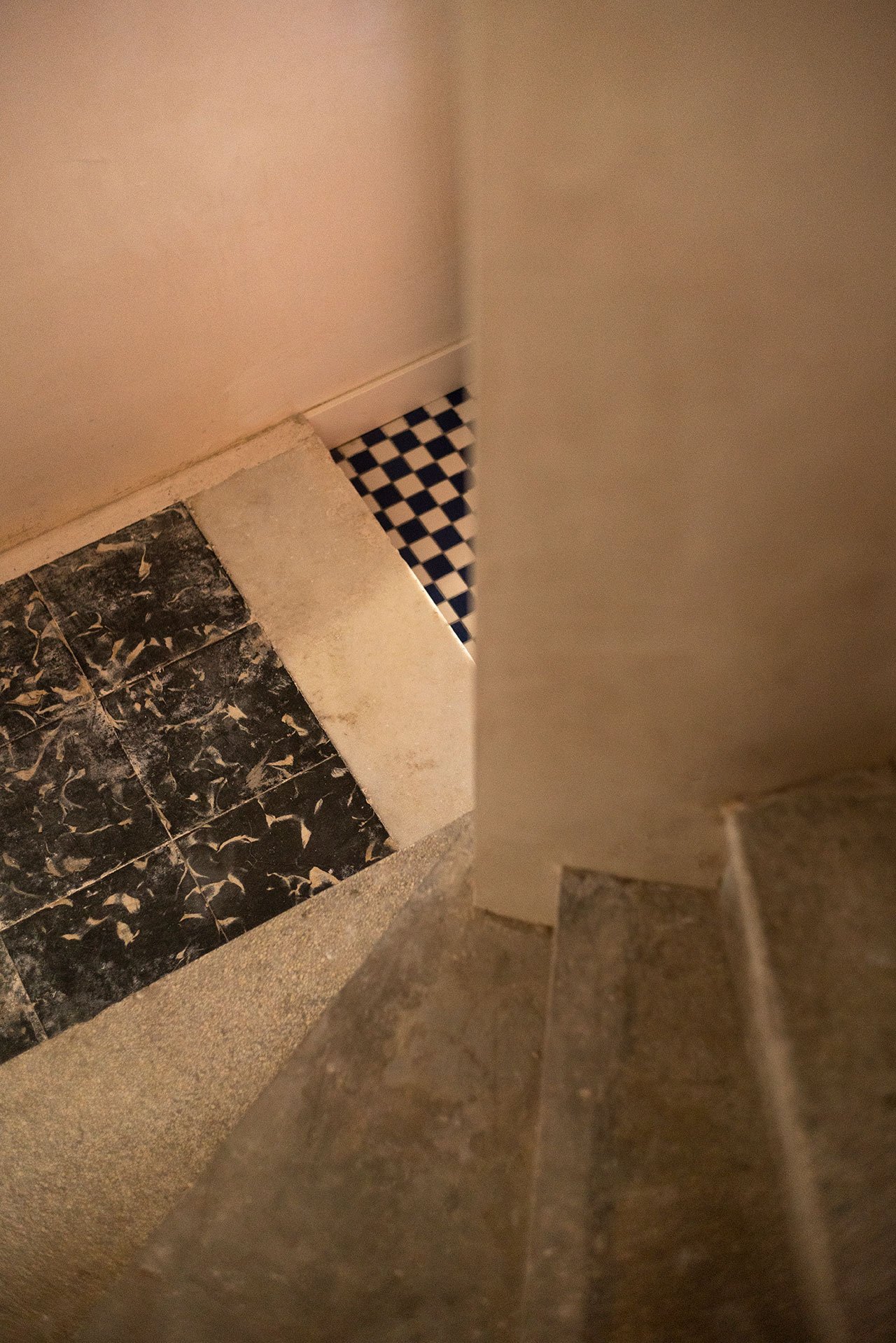 Built in 1946, the two storey house had been left abandoned for numerous years, to the detriment of its building fabric. Stripped down to its core, the property’s original masonry walls have been partly left exposed, while its decorative mouldings have been meticulously refurbished, a testament to the team’s background in architectural heritage conservation. The weathered brickwork is contrasted with the white and blue checkerboard tiling, which the team also applied across the floors and part of the walls. Moderately modern in sensibility, the graphic tile design is a nod to the neighbourhood’s centuries-old local tradition of covering building facades with brightly coloured tiles, usually in maritime shades like blue, green and white, often featuring zigzag or checkerboard patterns. Timber furnishings, which include salvaged carpentry such as doors that have been stripped and waxed, along with new elements rendered in the same finish, serve to bring everything harmoniously together.