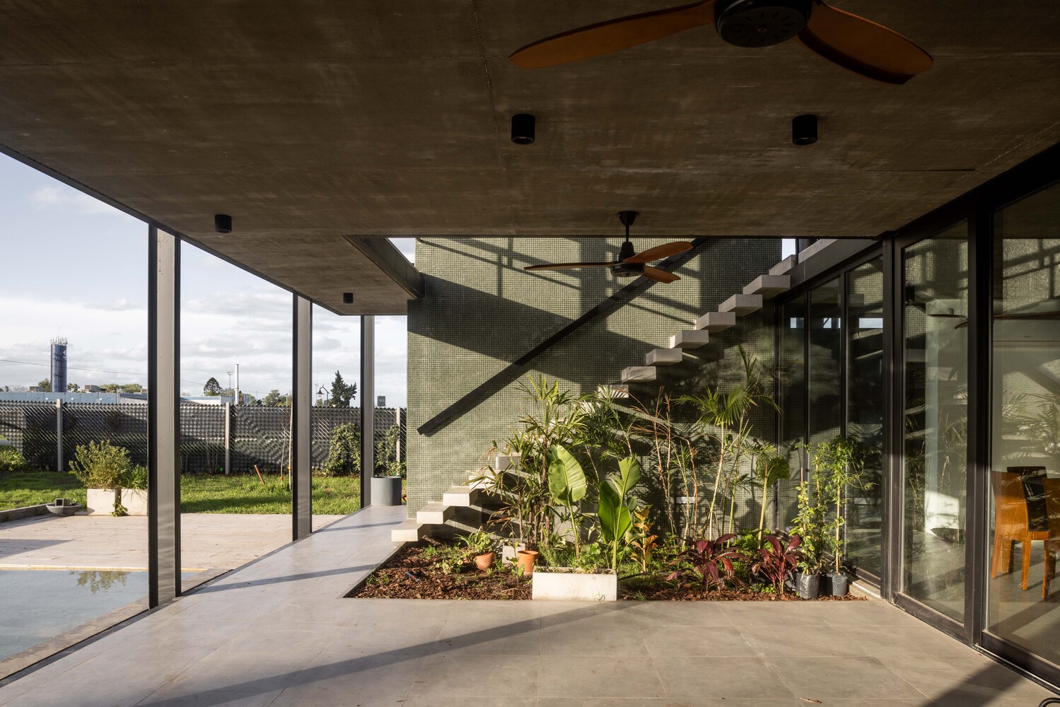 The south face, blinder, capitalizes on the mandatory perimeter withdrawal from upper continuous windows that guarantee cross ventilation in both the social ground floor and the first floor, where the private areas are located.