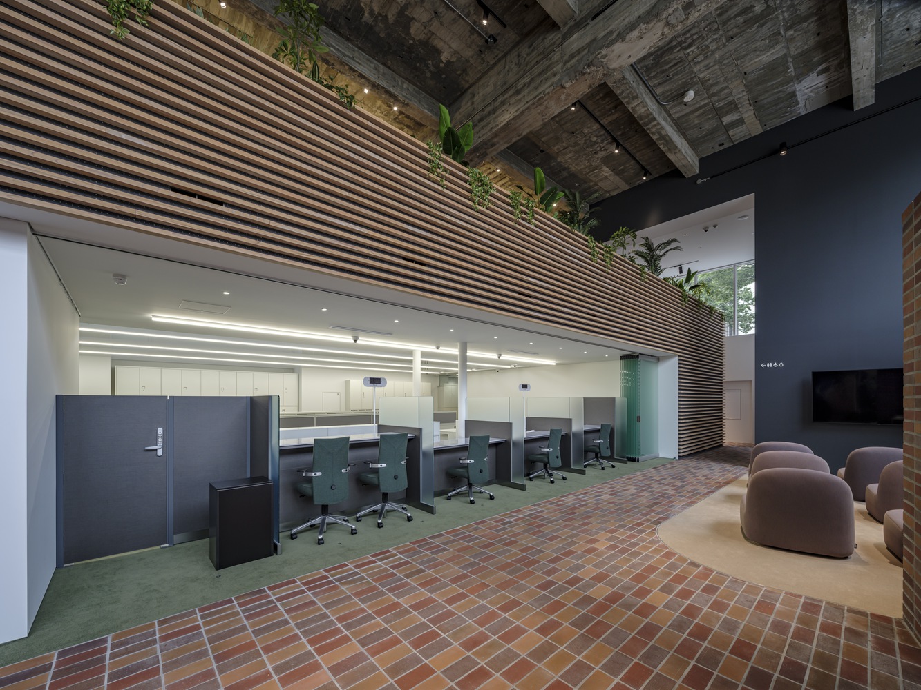 We envisioned the plaza as a "relay point" and a "resting place in the city." Our design offers shade and coolness in Maebashi, a city with intense summer heat, by scattering tall trees throughout the plaza and provides a variety of places using wood decks with moderate differences in elevation. The exterior walls of the two company buildings facing the plaza are covered with eaves, allowing people to continuously stroll through the roofed area from outside the city block to the plaza. The plaza is entirely paved with brick tiles, a common architectural language in Maebashi, creating a sense of continuity with other locations in the city. Irregularly shaped and raised planting strips, planted with tall trees, shrubs, and groundcovers, penetrate the brick tile pavement.
