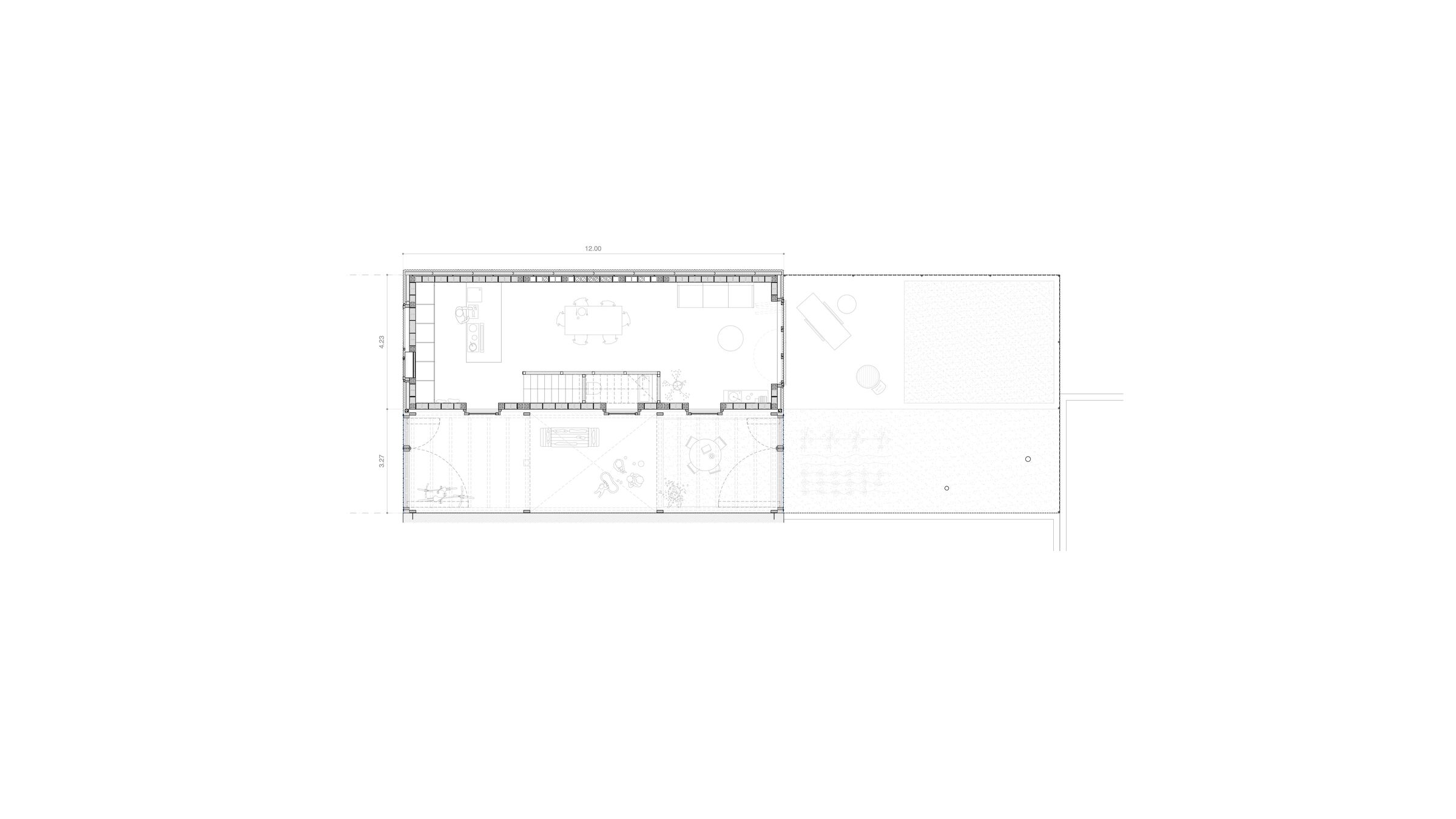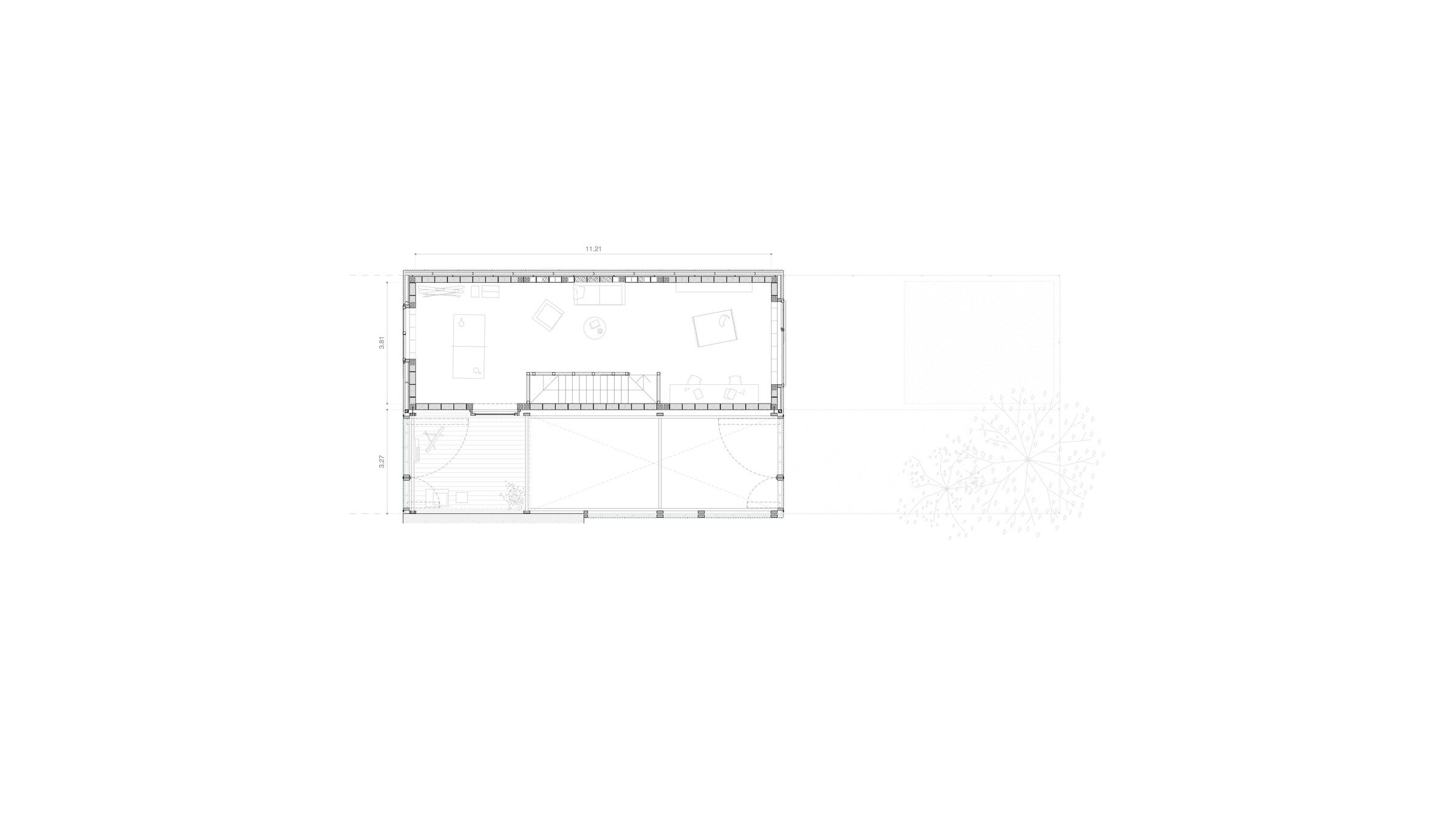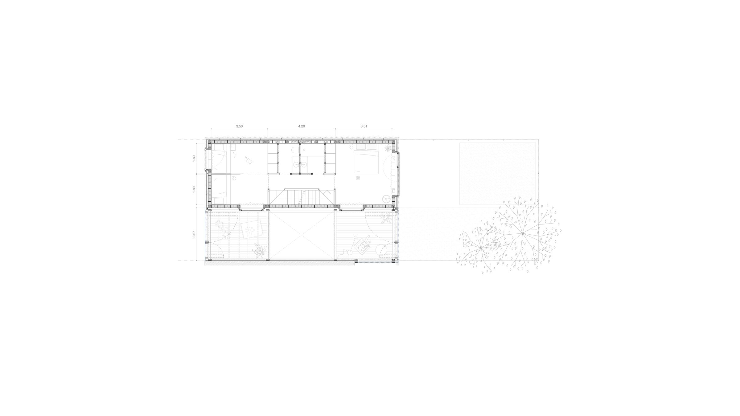 A house of two halves, taller11 placed the bedrooms and living areas in a heated volume of massive mortar block masonry. On the other side of this, the studio created a winter garden/sunroom — a light and transparent volume, built with a wooden frame, that facilitates solar capture. Suspended wood ceilings act as covered balconies, multipurpose spaces to be used for play and relaxation. The intermediate wall between the two halves has not been insulated — this “acts as an accumulator of incident solar radiation, releasing it into the interior at night,” says taller11. The specific thickness of this wall ensures it compensates for any energy loss.