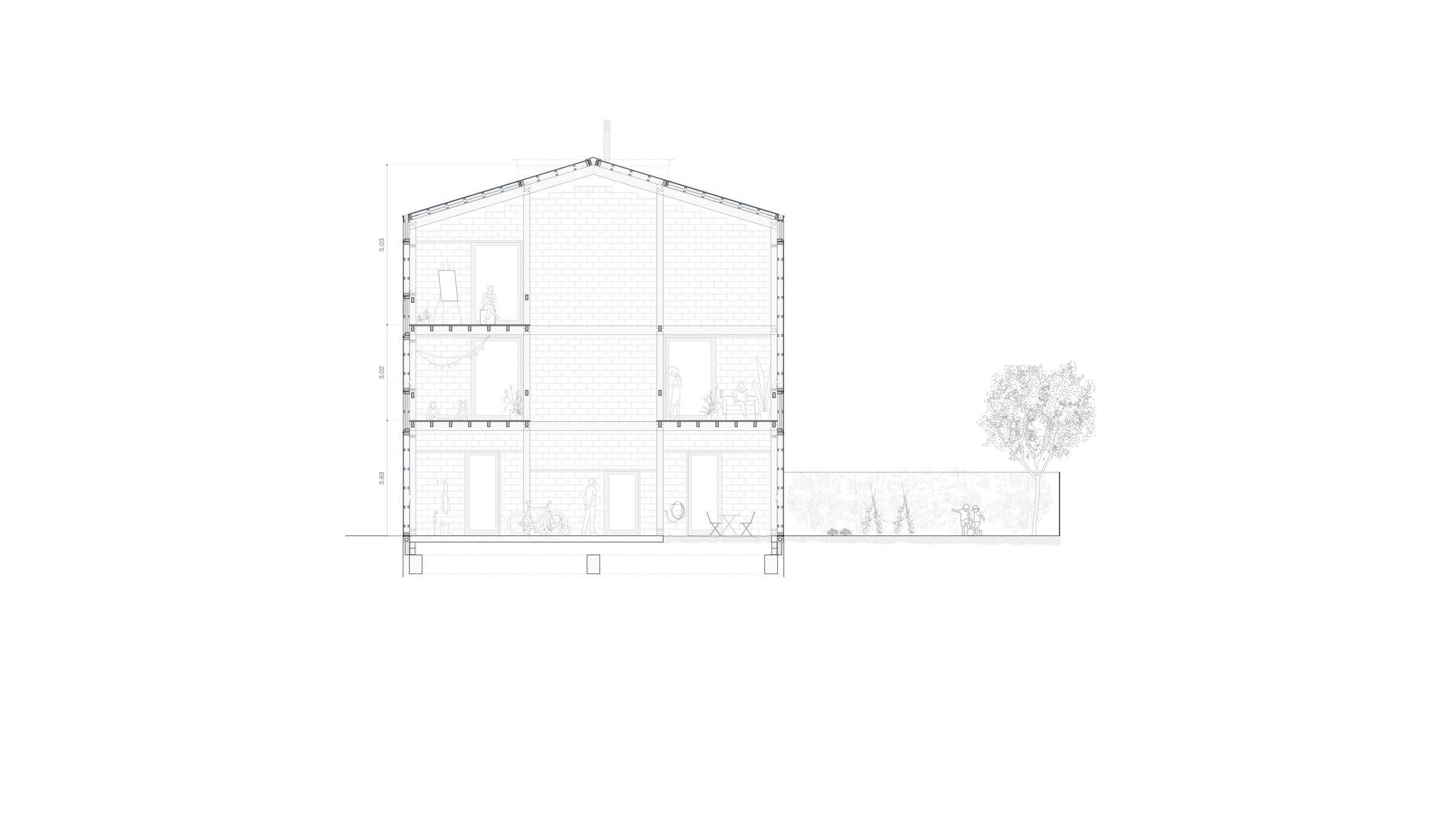 The winter garden/sunroom improves the performance of an outdoor aerothermal unit (air source heat pump) and contributes to heating the house. Large openings on the south east facade provide cross ventilation. To prevent heat loss, the roof, exterior facade, and party wall are insulated using wood fibre panels. Heat via the thermal concrete core activation of a 20-centimeter-thick concrete slab on the ground floor, spreads to the home’s upper levels.