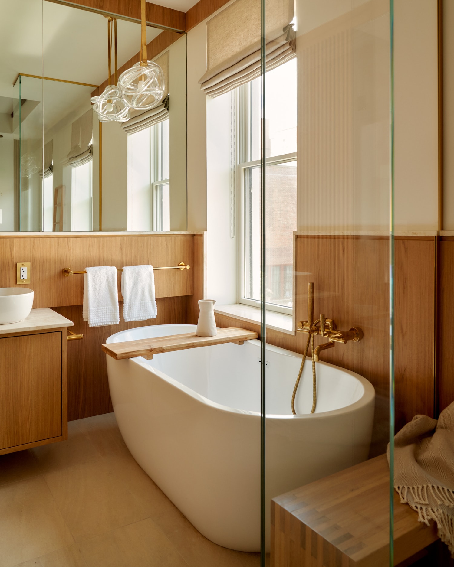 The color palette for the home featured warm whites, complementing the wood tones and creating a welcoming atmosphere. Colorful accents were incorporated at the suggestion of one of the homeowners, who has a design background. This included artworks like Marc Gabor’s ‘Vizcaino Desert Diptych’ from the Tappan Collective in the kitchen and dining area, and photographs inspired by the homeowners’ desert travels in the United States. Materials such as travertine and lime wash were strategically used to enhance the richness of the spaces. Hung’s design philosophy was to create a sense of calm luxury, achieved through the use of unlacquered brass fixtures, custom lighting, and lime wash finishes, all contributing to an atmosphere of clean, organized tranquility.