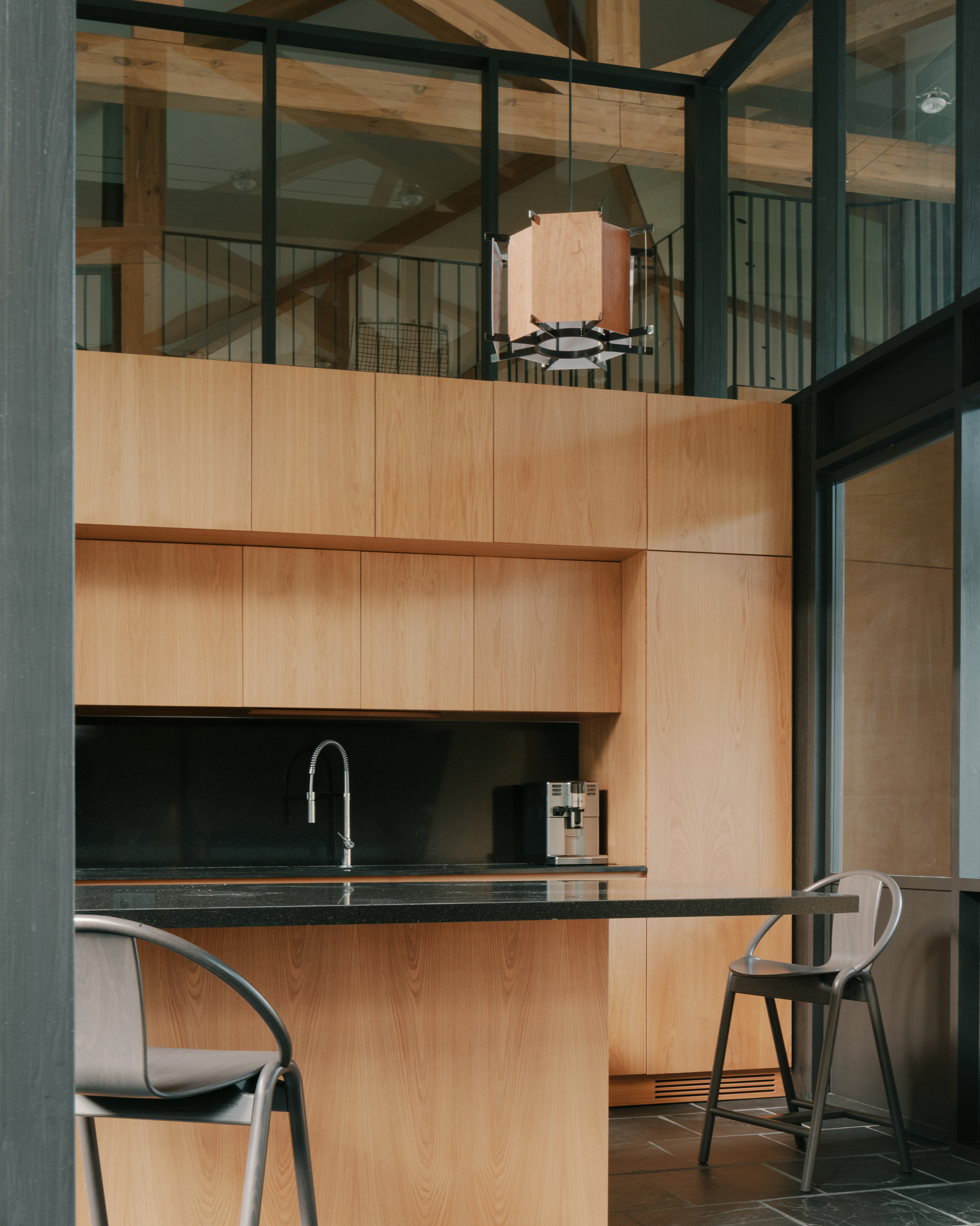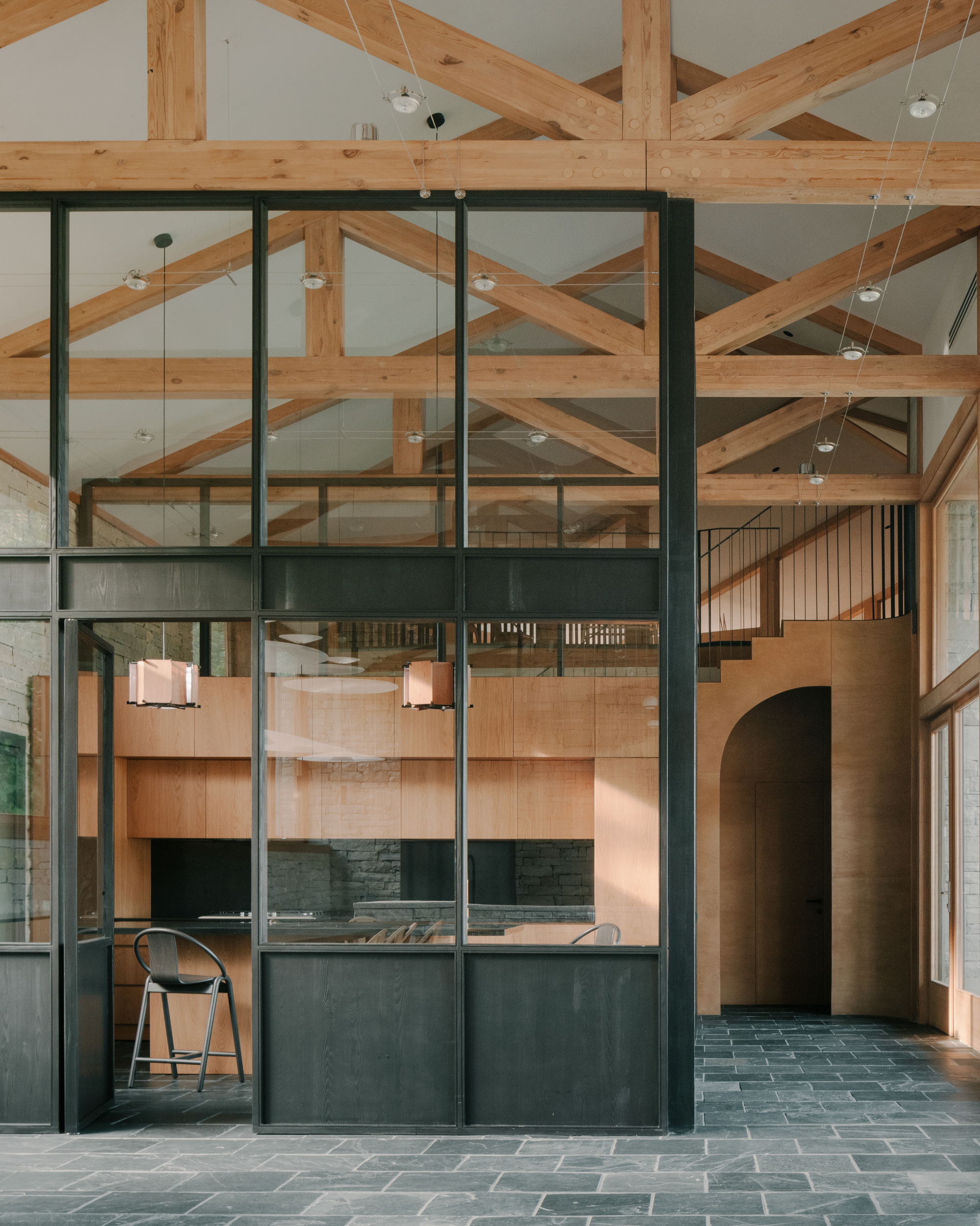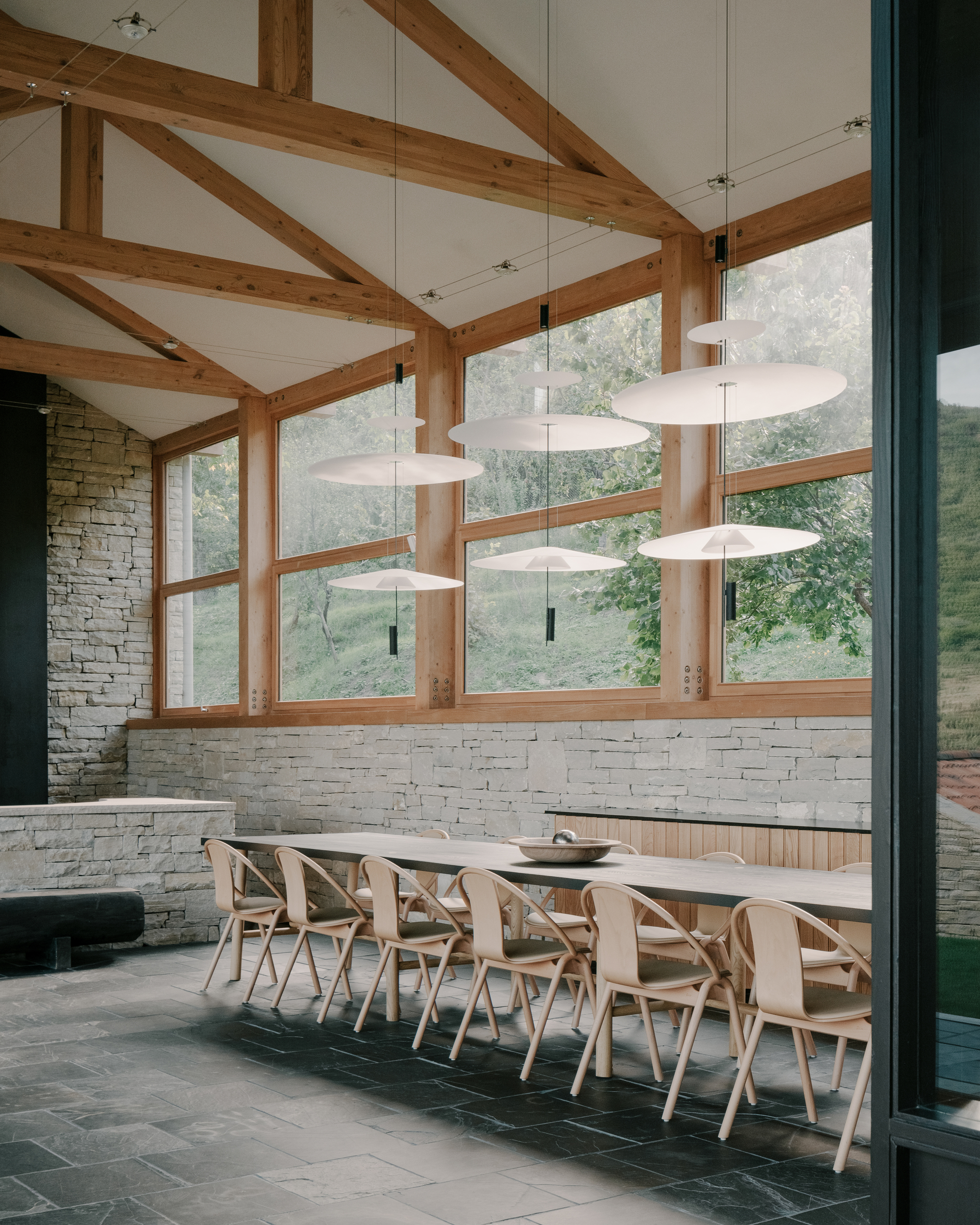 House in Tvaladi is a minimal residence located in Tvaladi, Georgia, designed by NS Studio. This house, a study in architectural harmony, pairs a classic stone façade with modern structural forms. Constructed as a single-story edifice, the house employs a combination of stone and wood. These materials are not merely structural; they play a significant role in defining the interior’s character. The design intentionally blurs the boundaries between the building and its natural surroundings. This is achieved through the use of large windows and openings in the façade, which not only flood the interior with natural light but also visually integrate the house with the landscape outside. Inside, the residence celebrates a juxtaposition of textures and finishes. The design approach carefully balances raw, tactile elements with more refined details, creating a cohesive interior environment. Complementing the main structure is a cellar, positioned perpendicular to the house. This additional element mirrors the primary architectural language, contributing to a unified aesthetic across the property.