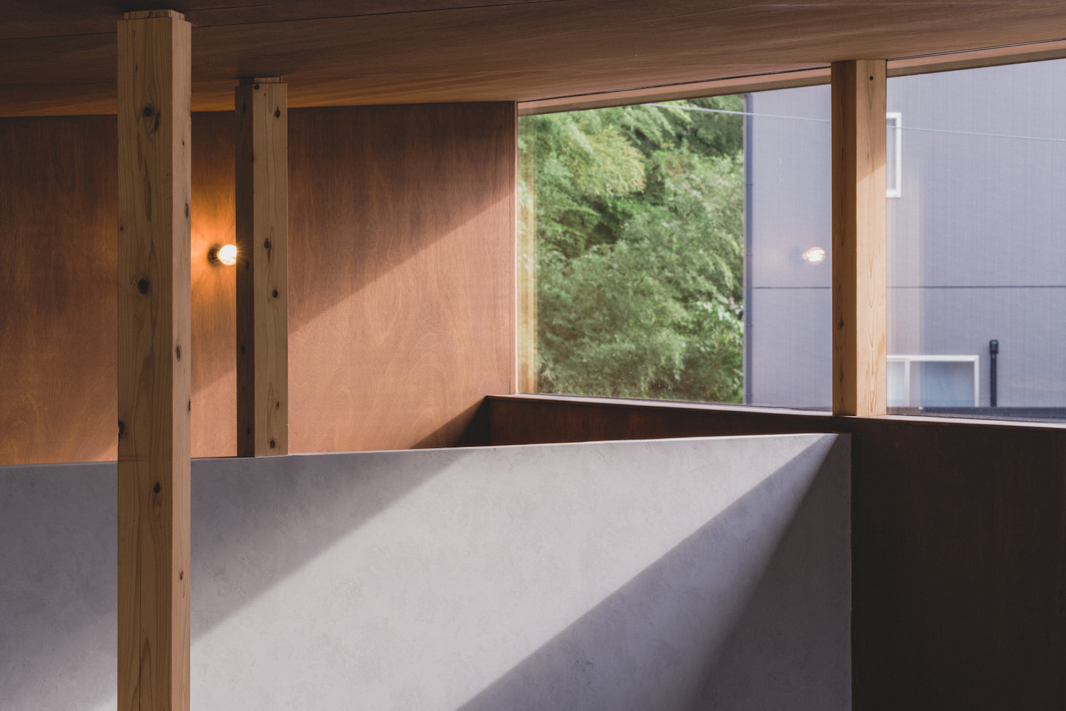 Clerestory windows, set above these walls, give the illusion of a floating roof. The interior is marked by a large, open area interspersed with box like structures housing private functions such as bathrooms. These boxes, along with a series of pillars, create a depth and complexity in the space, encouraging the inhabitants’ free movement and activity. A notable feature of this home is its use of pillars. Spaced 1.8 meters apart, these 90mm square columns, extending up to 3.5 meters in height, mimic the density and scale of furniture, creating an atmosphere akin to a forest.