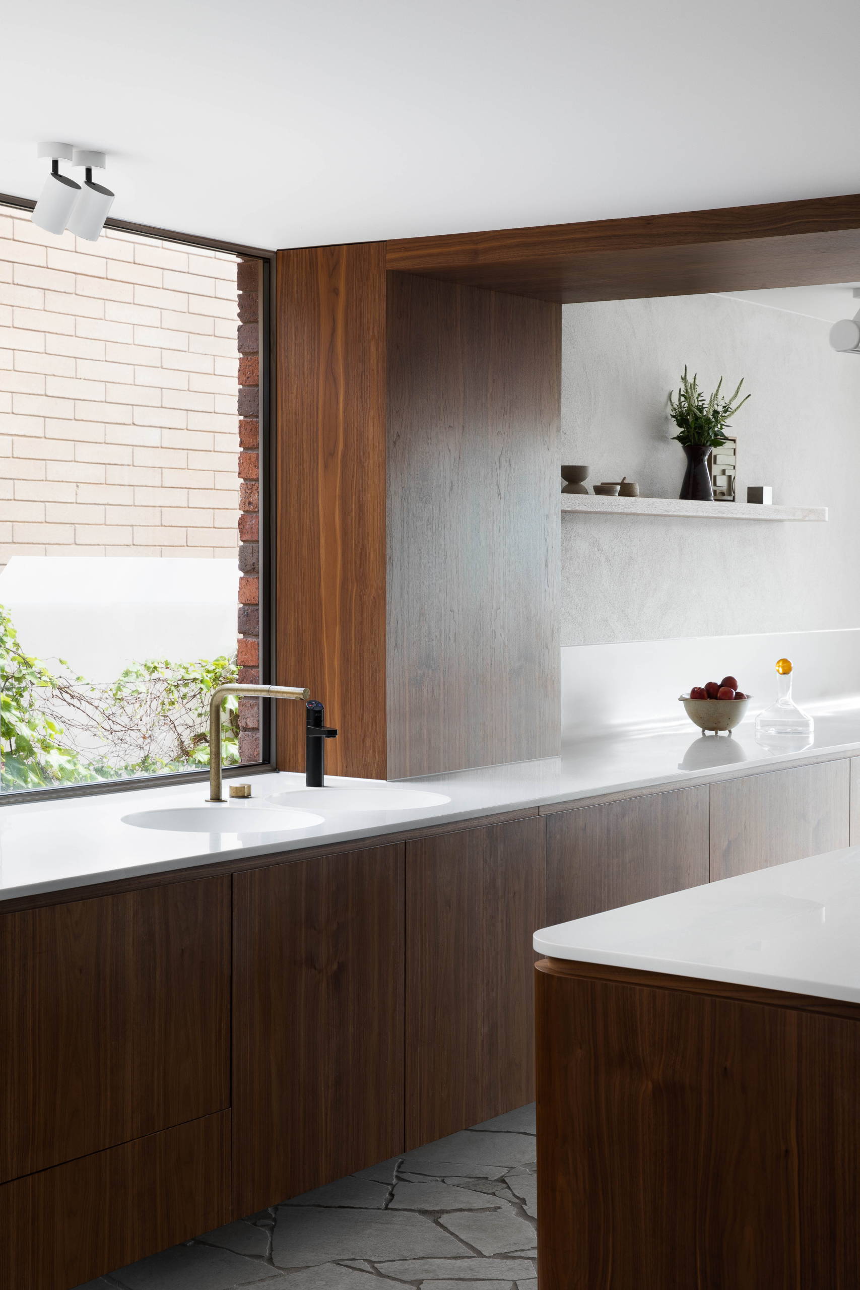 Inspired by the clients’ desire to honour the essence of the original home –designed by esteemed Melbourne architectural firm Chancellor and Patrick – Raheen is a modern reinterpretation of a classic 1970s residence. Located east of the Melbourne CBD in Kew, the home is owned by Sam Scally, co-founder of slow-fashion brand The FLATIRON Label, whose eye for high-quality design extends to her home.