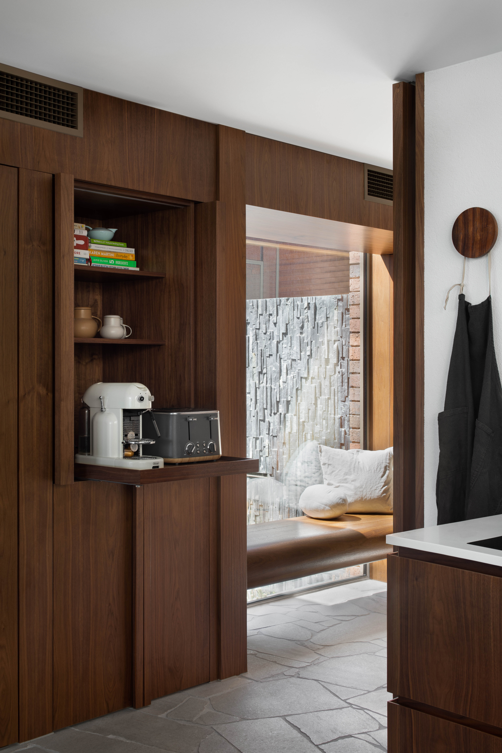 The architects took a highly considered approach to layering between authentic elements, modern furnishings and sleek craftsmanship. Features such as textured brickwork, cedar-clad vaulted ceilings, German blown glass chandeliers and wall-hung ashtrays were juxtaposed with contemporary materials like natural rattan, rolled-edge Corian benchtops in the kitchen, rich warm walnut finishes and mixed metal accents.