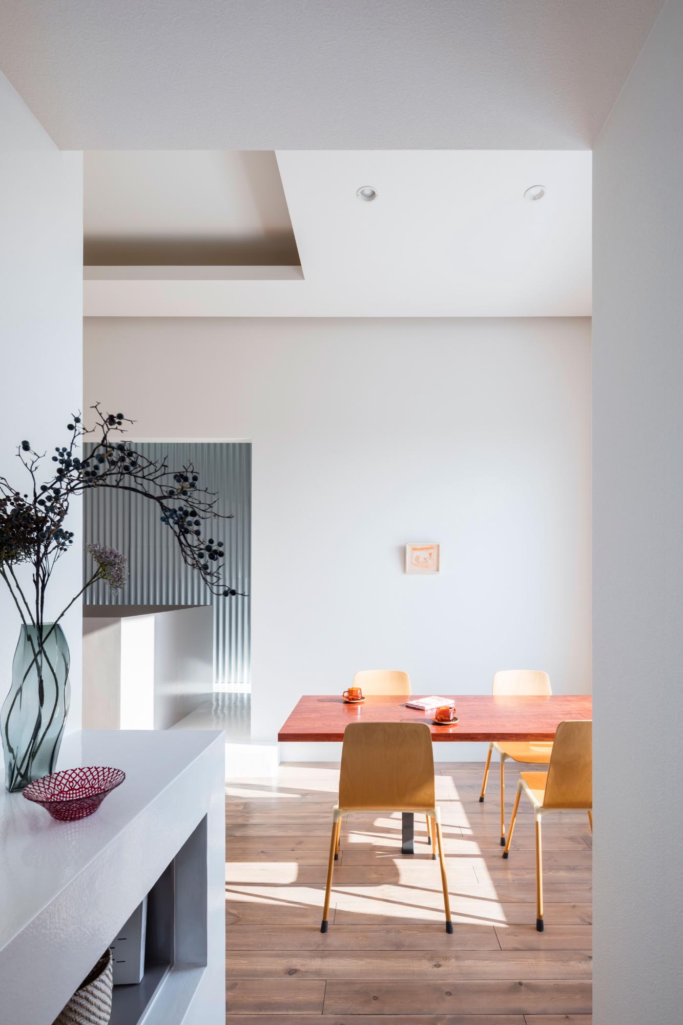 The living dining room with bright light has a coved ceiling which provides gradation of gentle light. The manipulated lights are introduced in the architectural space to characterize each room.